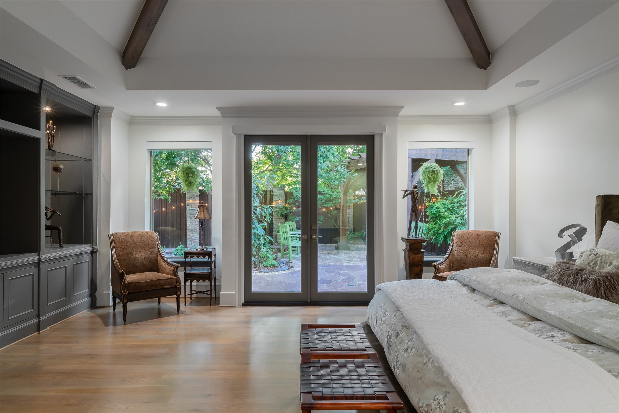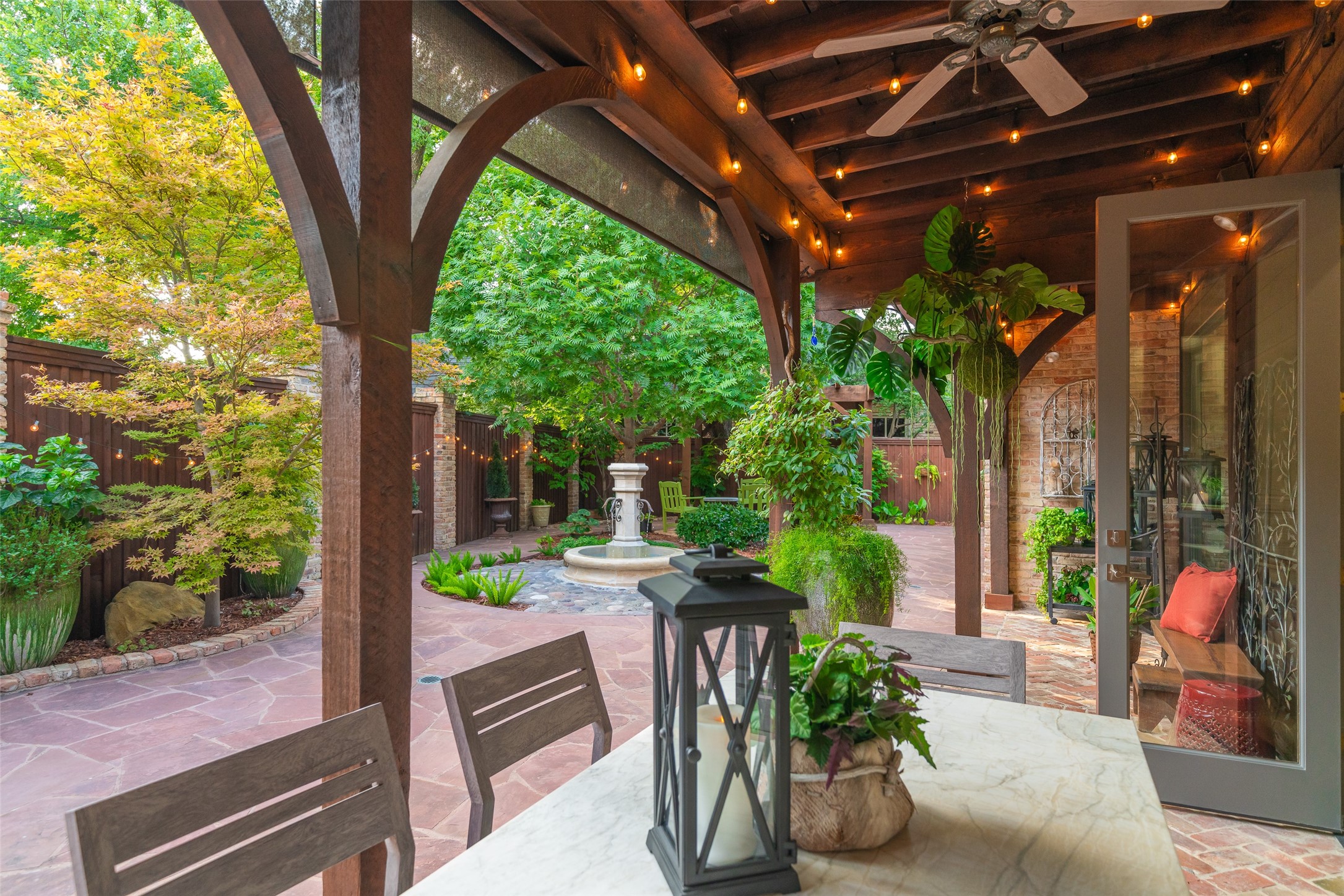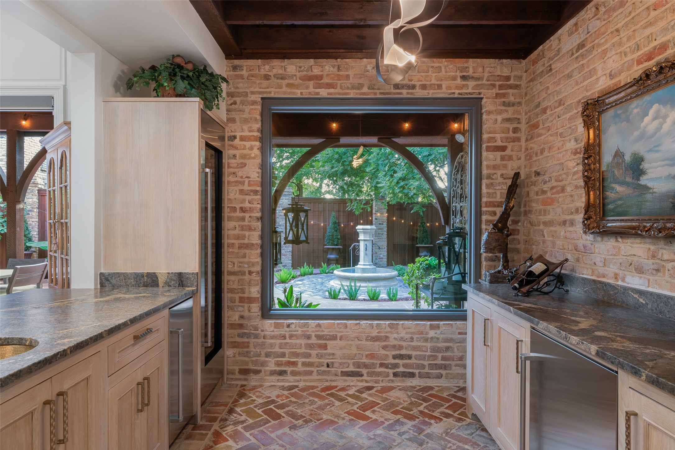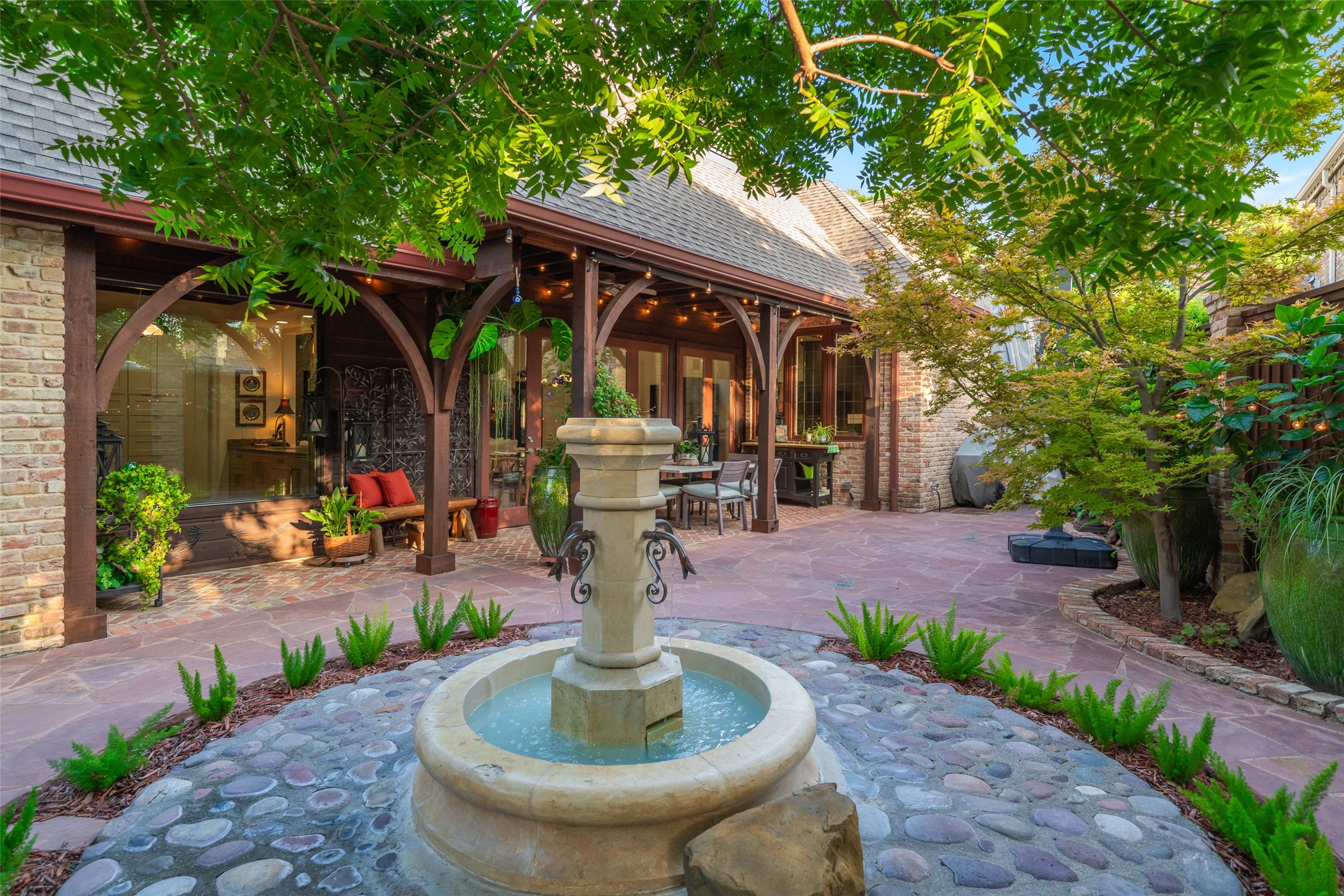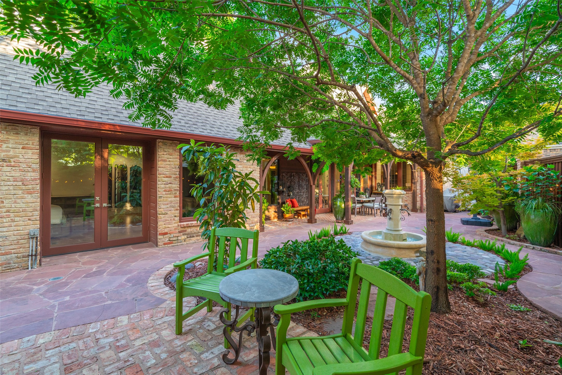 Your sanctuary awaits. Masterfully remodeled, single-story in exclusive Chalfont Place. Rare opportunity to own an enchanting home of this quality and character. Soaring ceilings, walls of windows & French doors, Lutron lighting, every detail done. Chef's kitchen, state-of-the-art appliances, sleek countertops, oversized island, & cozy fireplace. Open living & dining, hidden cabinets, electric shades & second fireplace. Experience the Bar's brick flooring, wood-beamed ceiling, Subzero wine cooler, icemaker, frig, & perfect picture window framing the courtyard fountain. Peaceful primary suite with stunning views to the manicured gardens, cathedral ceiling, dbl-sided bath, closets & toilets, free-standing tub. You'll find it impossible to stay indoors with the magical patio, tranquil gardens, fountain, arbor, walkways, lush landscaping. Guest bedroom-office + ensuite, and separate third bedroom + large bath. Impeccable living, ultra-private, yet minutes from all that Dallas has to offer!