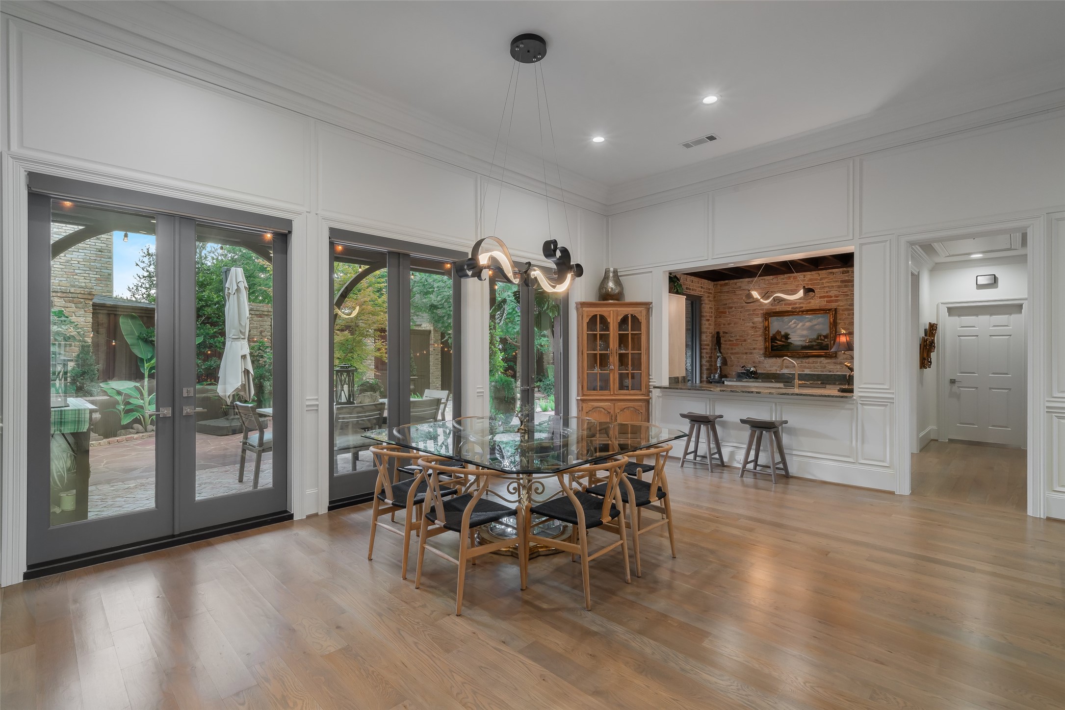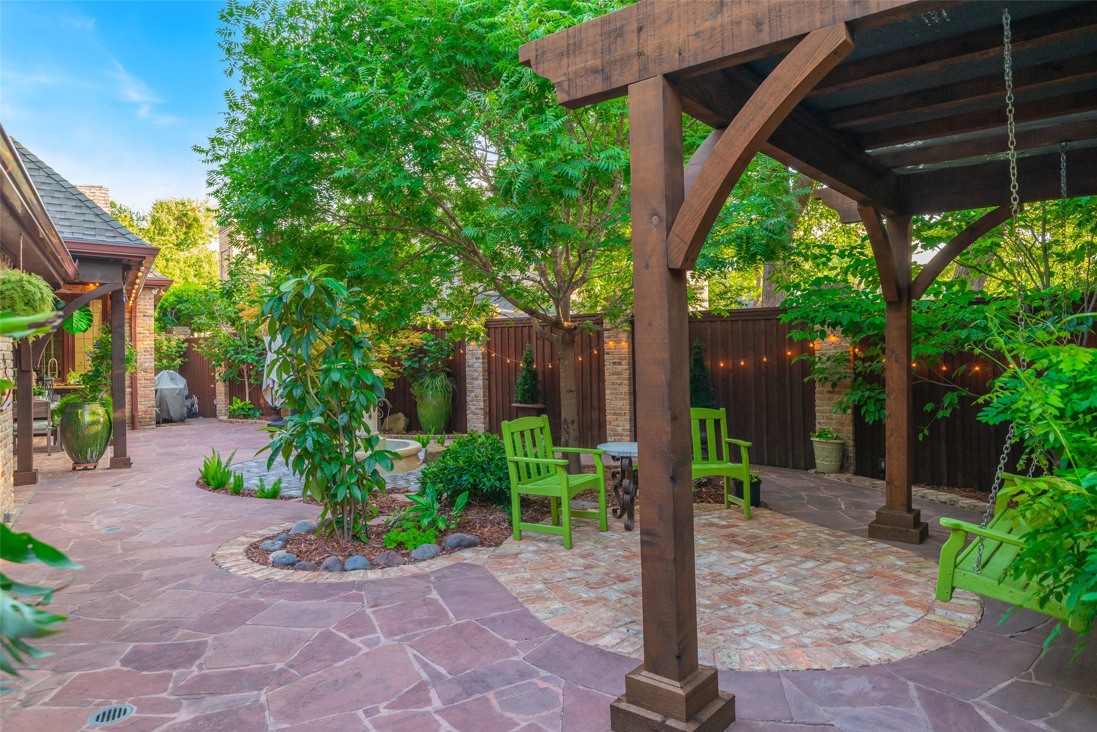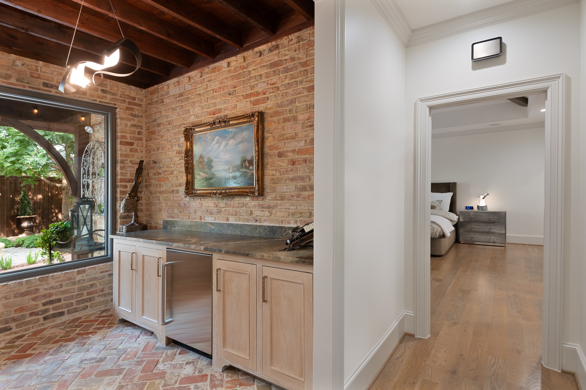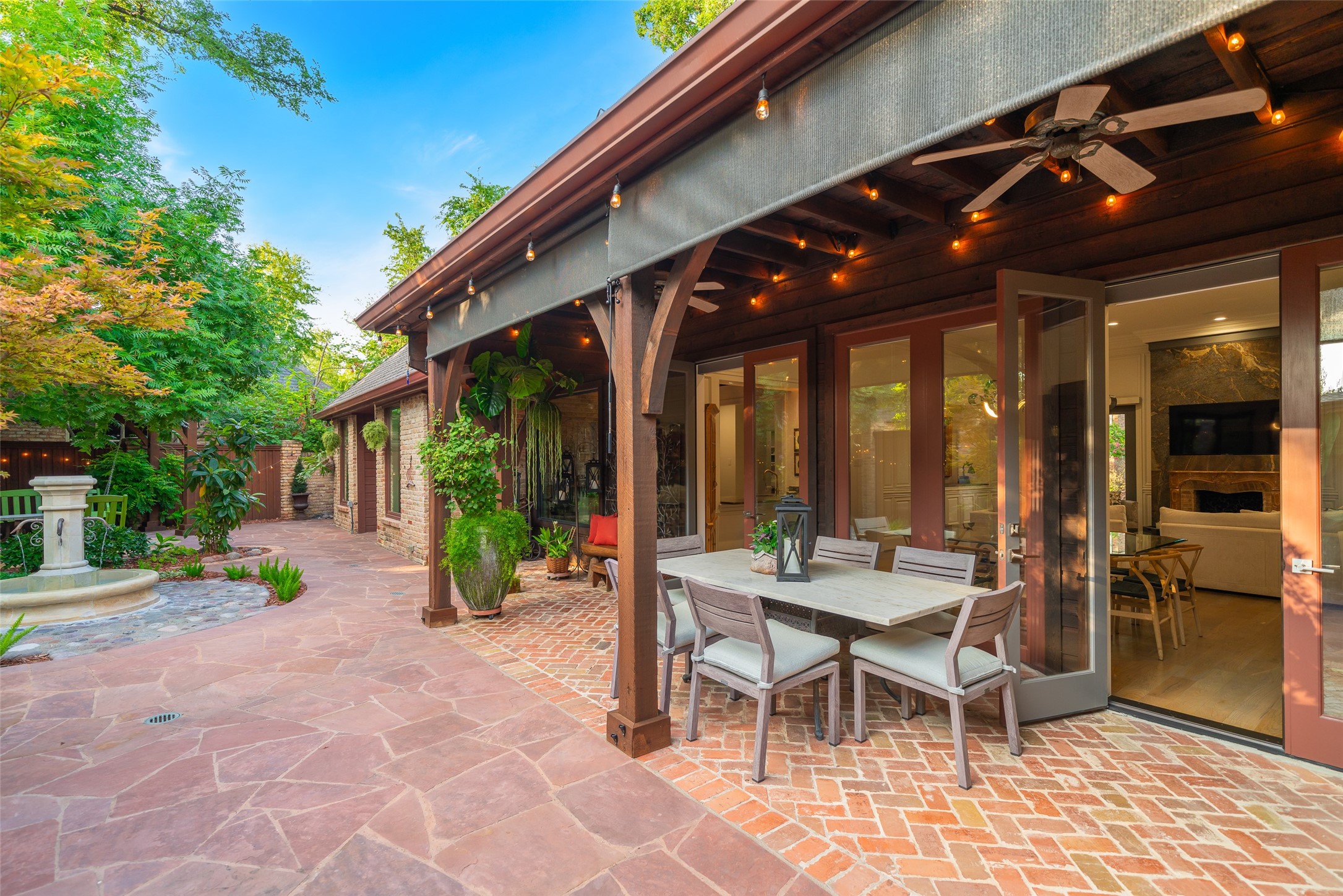 Your sanctuary awaits. Masterfully remodeled, single-story in exclusive Chalfont Place. Rare opportunity to own an enchanting home of this quality and character. Soaring ceilings, walls of windows & French doors, Lutron lighting, every detail done. Chef's kitchen, state-of-the-art appliances, sleek countertops, oversized island, & cozy fireplace. Open living & dining, hidden cabinets, electric shades & second fireplace. Experience the Bar's brick flooring, wood-beamed ceiling, Subzero wine cooler, icemaker, frig, & perfect picture window framing the courtyard fountain. Peaceful primary suite with stunning views to the manicured gardens, cathedral ceiling, dbl-sided bath, closets & toilets, free-standing tub. You'll find it impossible to stay indoors with the magical patio, tranquil gardens, fountain, arbor, walkways, lush landscaping. Guest bedroom-office + ensuite, and separate third bedroom + large bath. Impeccable living, ultra-private, yet minutes from all that Dallas has to offer!