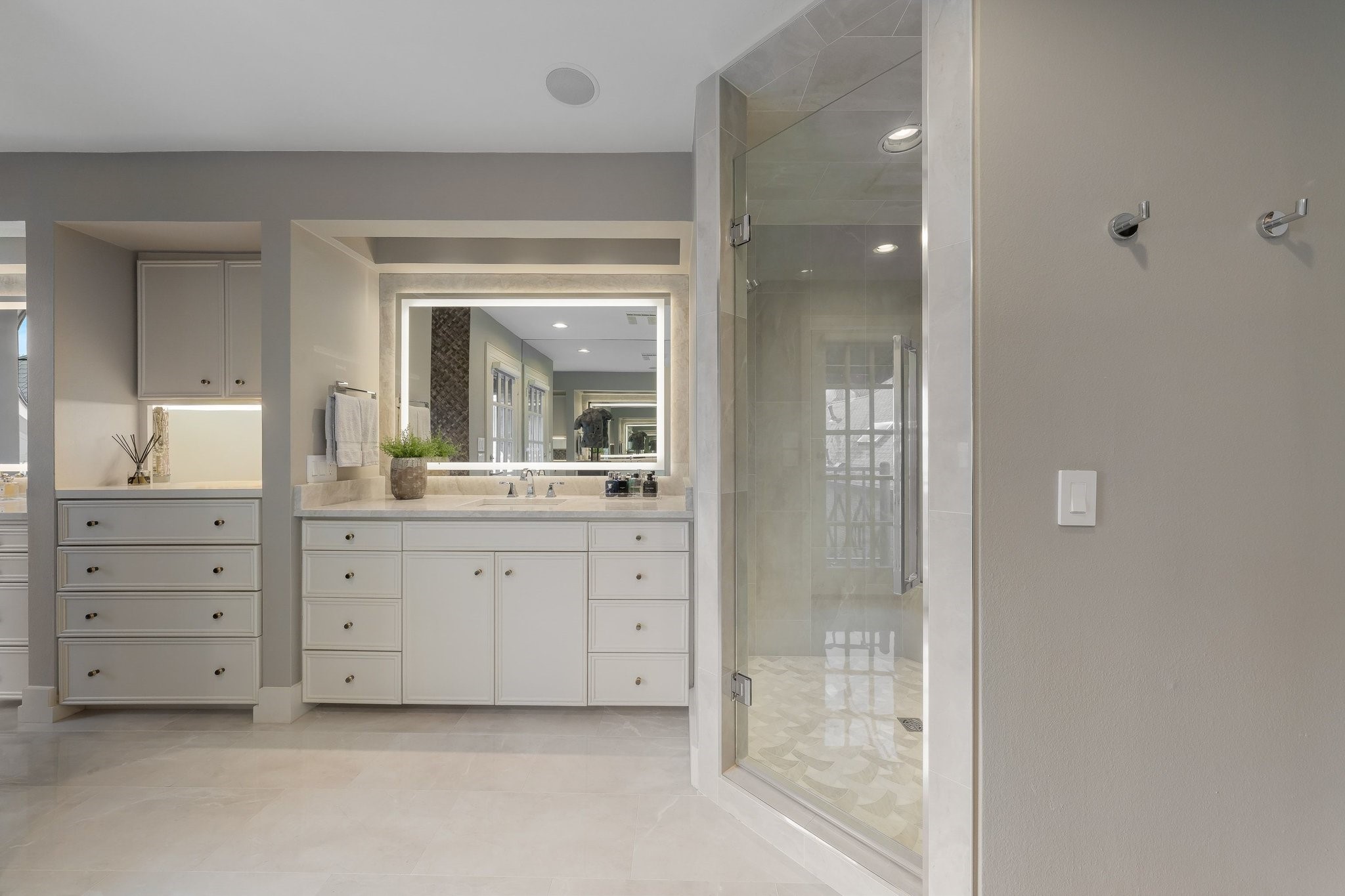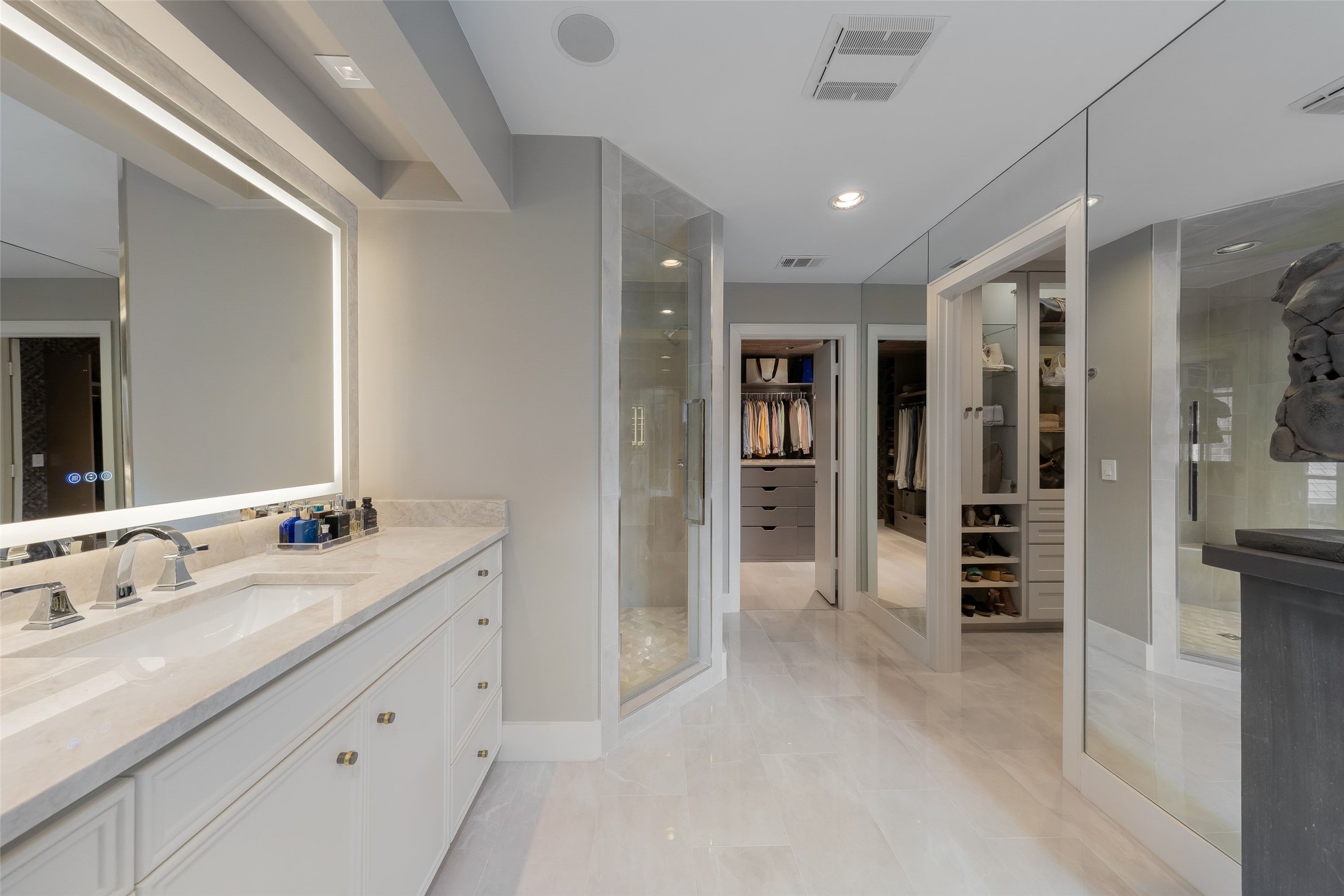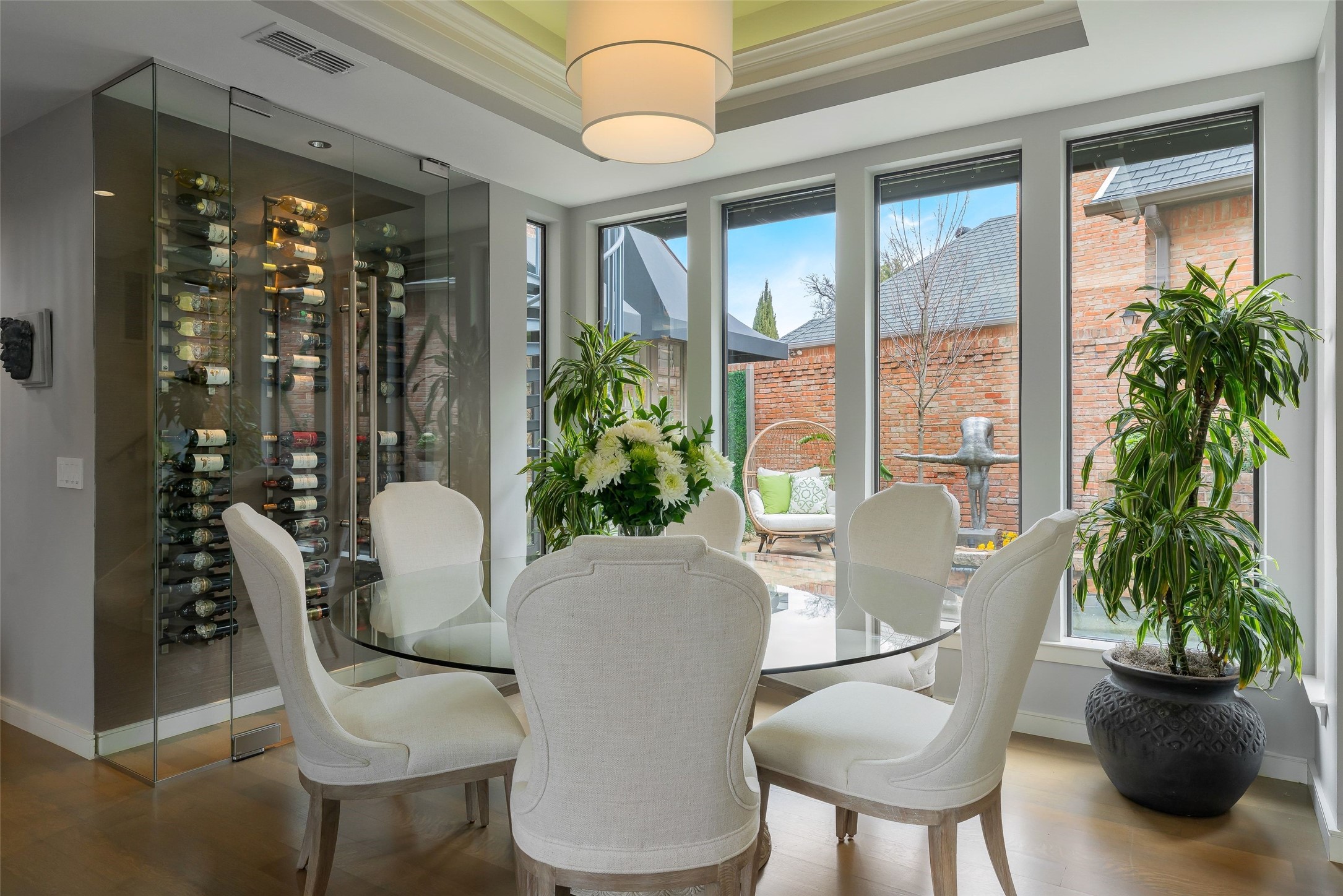 Featured in Dallas Style & Design Magazine, masterfully done, bold, yet refined, 16037 Chalfont is a stunning blend of style on every level. Updated, with an inviting California modern flair, you'll find it impossible to say anything but YES to soaring ceilings, walls of windows, curated spaces, and endless views - that's just the beginning. The captivating two-story entry, accented by oversized windows and curved staircase, opens to the split living and dining with a built-in wine wall, both overlooking an exquisite pool & back patio. Open and light, gorgeous wood floors, built-in fireplace, back-lit tray ceilings, electric shades, bar, double sliding doors out to the pool, and designer lighting. Around the corner, you'll find a dreamy kitchen-breakfast area and adjacent conservatory filled with light, inviting you to enjoy more incredible views of the pool. Chef's kitchen, quartzite counters, SS appliances, built-in refrigerator, warming drawer, island, and a double pantry you'll love. Occupying the entire 2nd floor, the upstairs master suite is pure luxury, with its fireplace, private living area, mini-bar, desk, electric blackout shades, and an opulent double-sided vanity and master bath you need to experience. Designer tile and quartzite counters, soaking tub and separate shower, completely custom closet + dressing area with the perfect built-ins, back-lit clothing cabinets, and wall of mirrors that will make you linger just a little longer. Don't forget the spiral stairs down to the pool. In between, you'll find a beautifully appointed guest suite & updated bath, plus another huge 2.5-floor bedroom-retreat with huge seating area, completely new bath, and amazing storage. The back patio and grotto-style pool are truly magical, with tranquil gardens, waterfall, stone walkways, lush landscaping, and pretty side patio under huge trees. This is a rare opportunity to own an impeccable home of this quality, ultra-private, yet minutes from all that Dallas has to offer