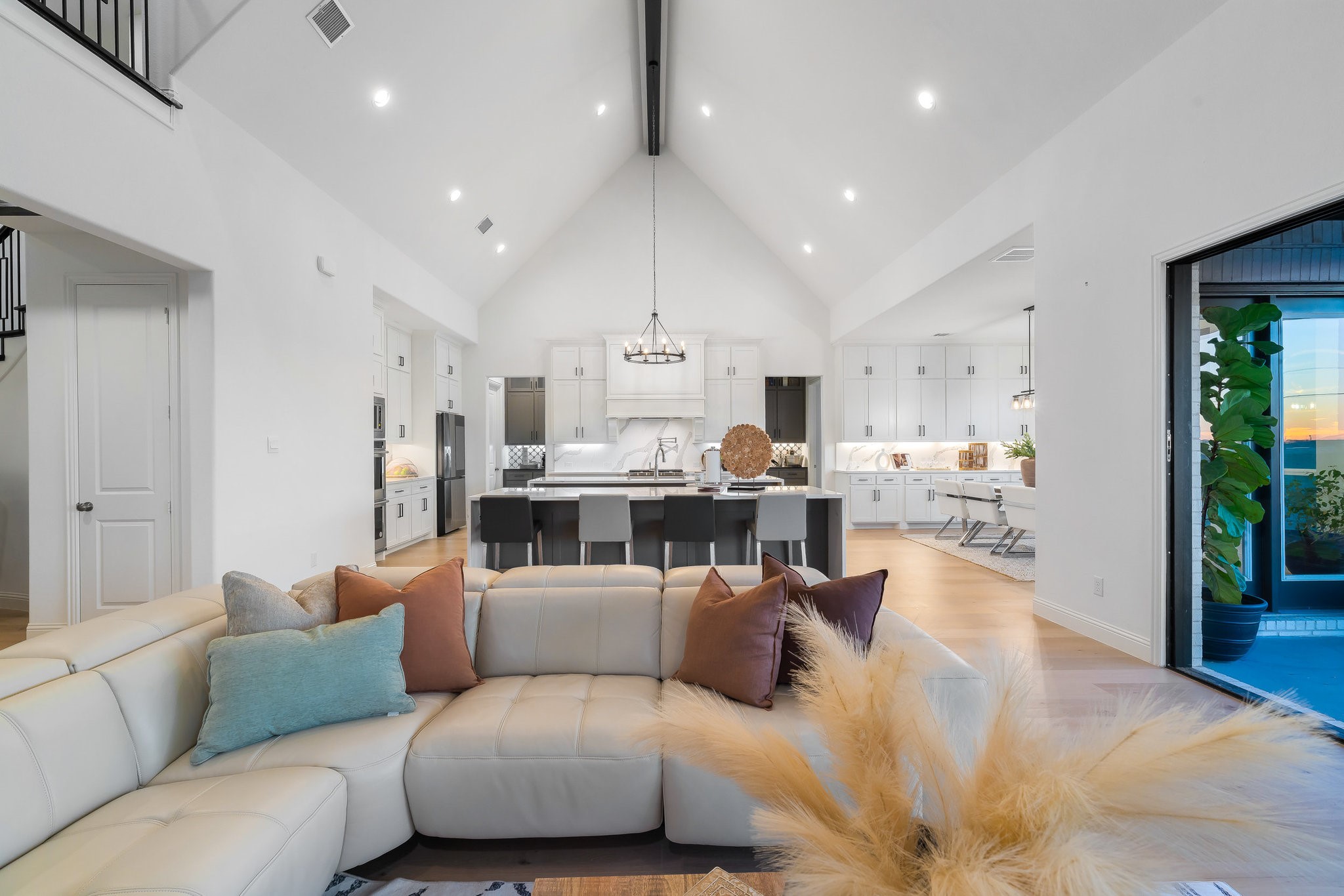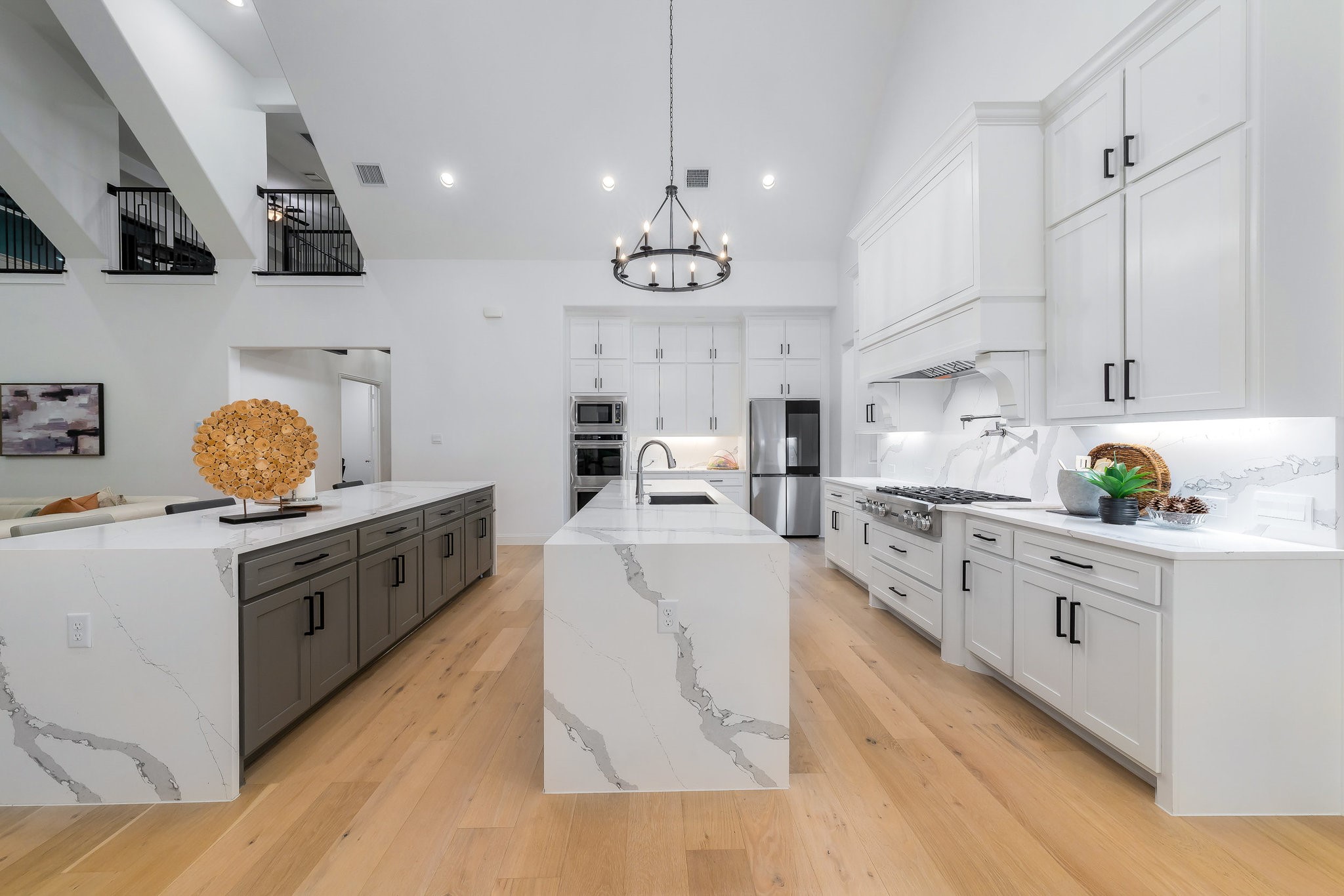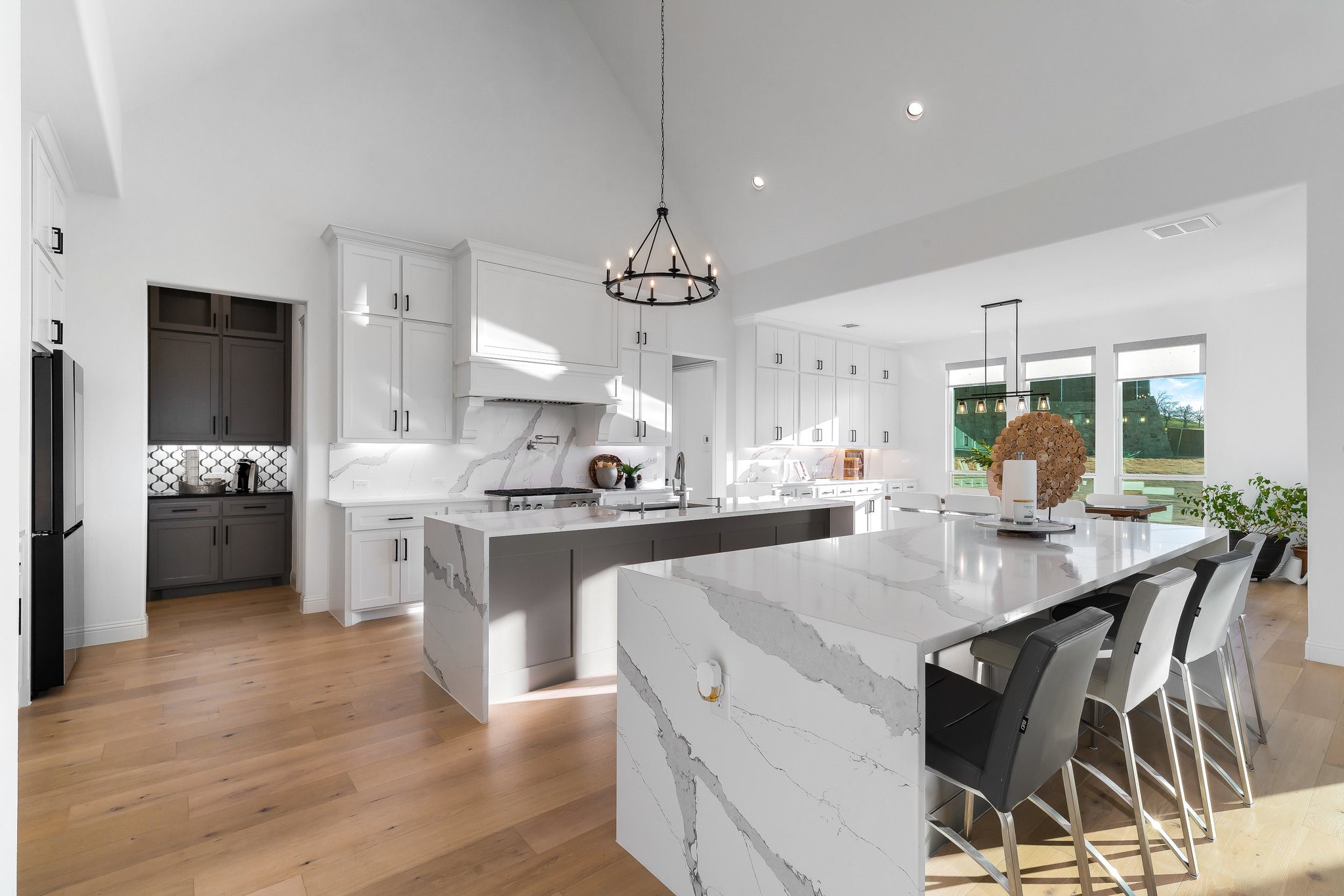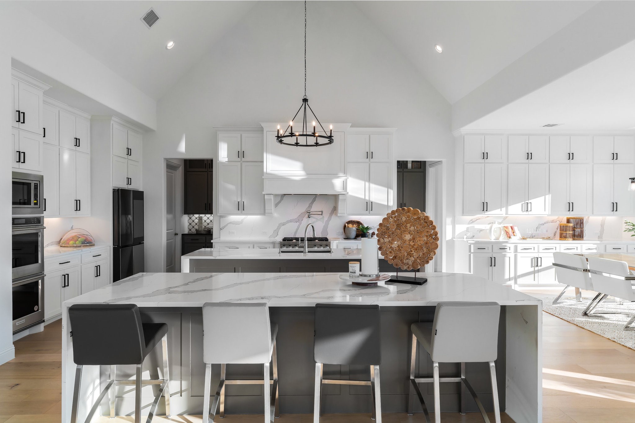 The spacious modern interior offers a Gourmet Kitchen full of expansive culinary spaces with stainless steel appliances, a double island, 6-burner gas stove, double oven, and ample storage. Live large in rooms with Cathedral ceilings and sliding glass doors creating seamless transitions between indoor and outdoor living. The spacious primary suite is a private retreat with an ensuite with separate vanities, garden tub, and a luxurious shower. Additional bedrooms offer ensuite amenities for ultimate comfort.
