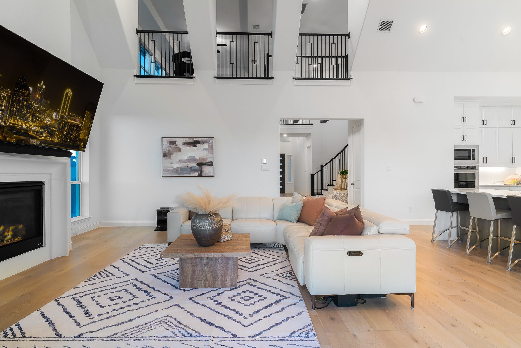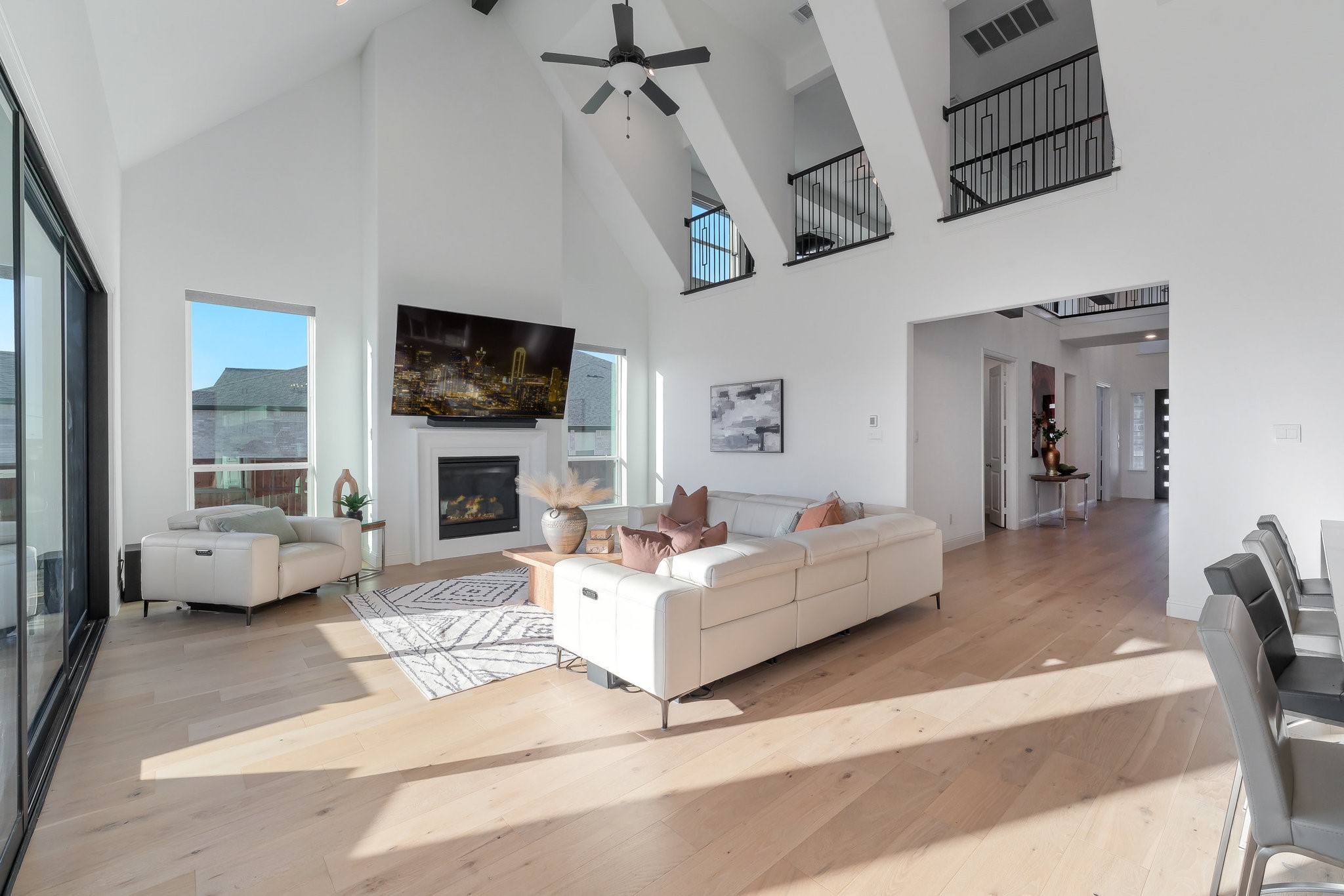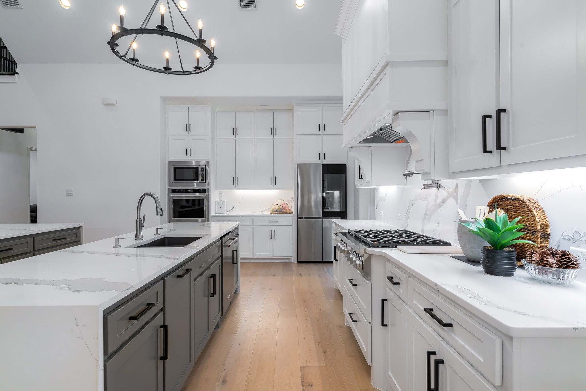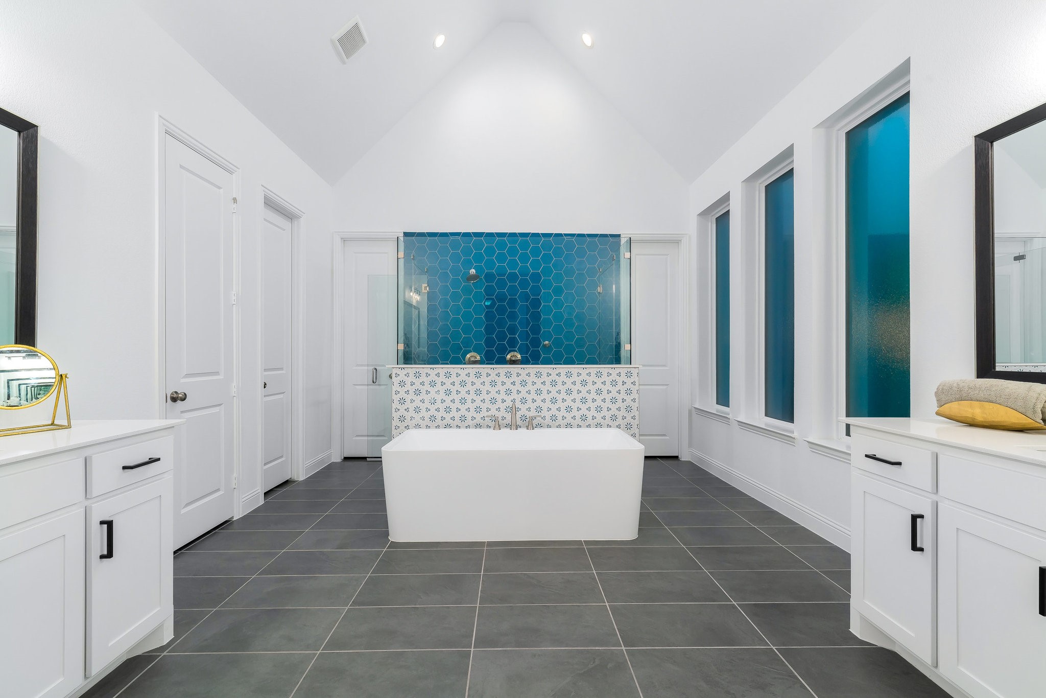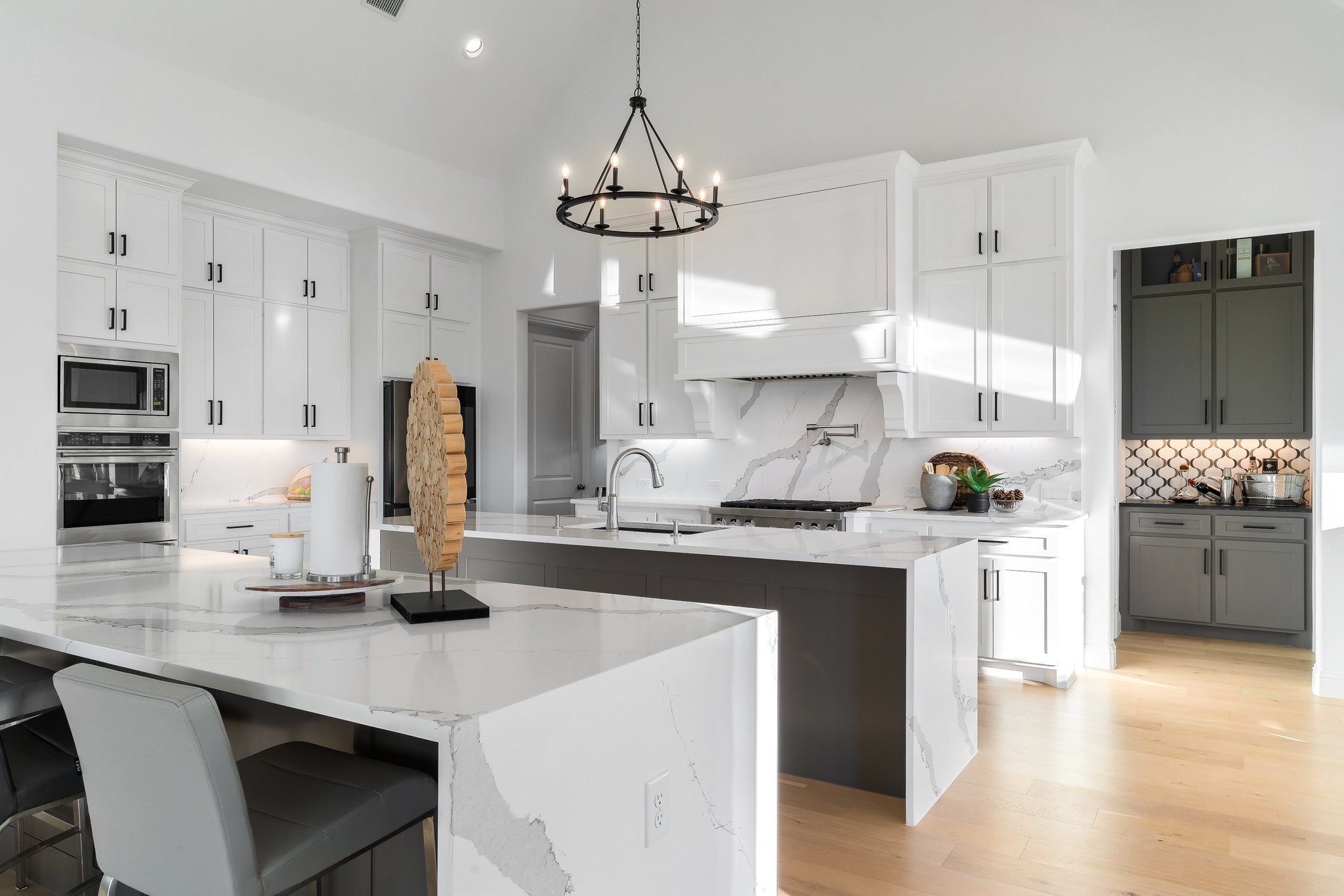 The spacious modern interior offers a Gourmet Kitchen full of expansive culinary spaces with stainless steel appliances, a double island, 6-burner gas stove, double oven, and ample storage. Live large in rooms with Cathedral ceilings and sliding glass doors creating seamless transitions between indoor and outdoor living. The spacious primary suite is a private retreat with an ensuite with separate vanities, garden tub, and a luxurious shower. Additional bedrooms offer ensuite amenities for ultimate comfort.