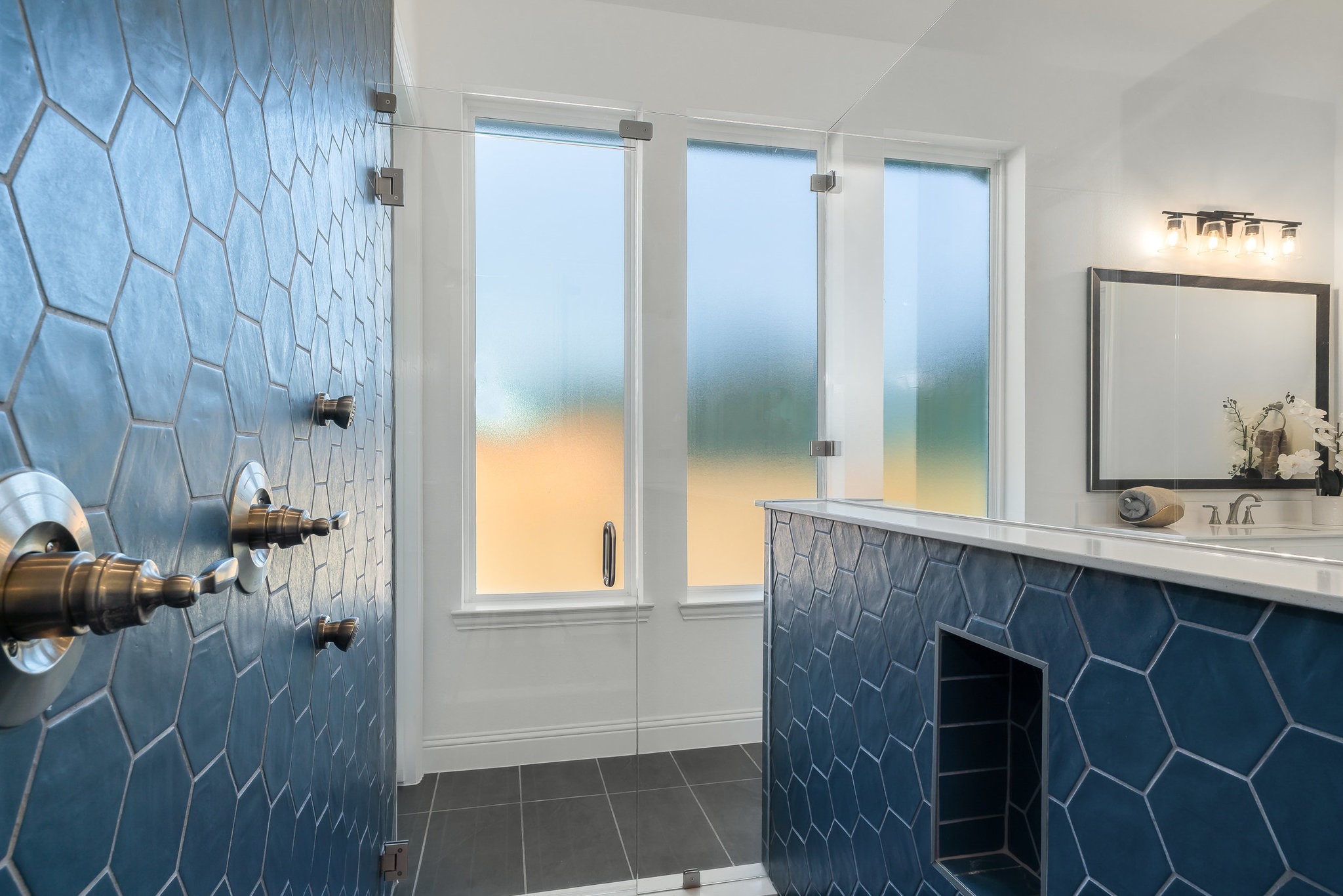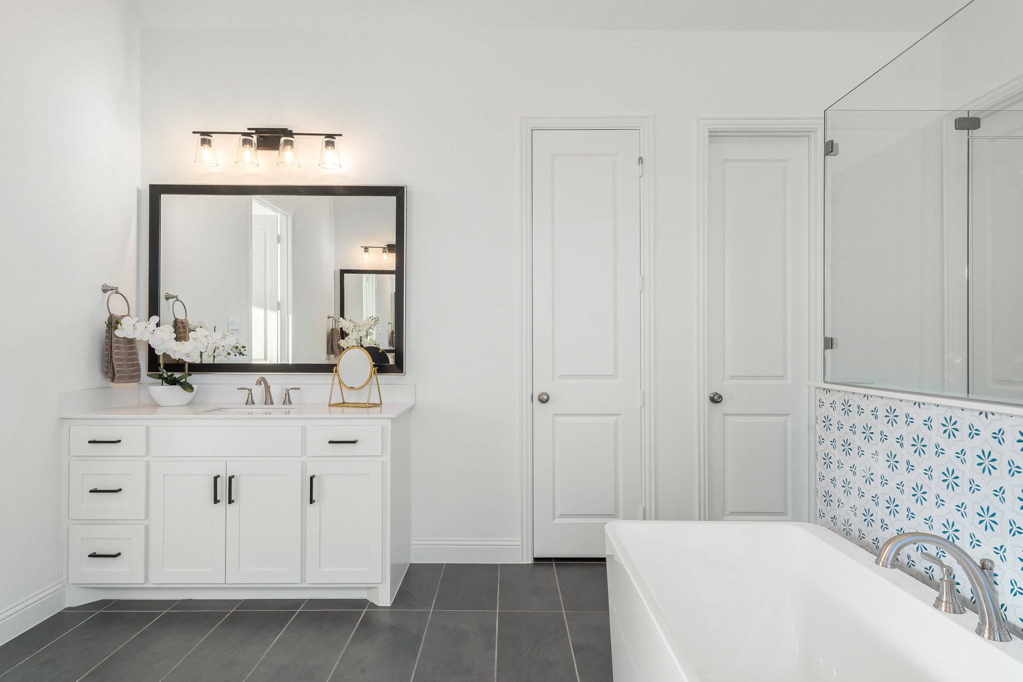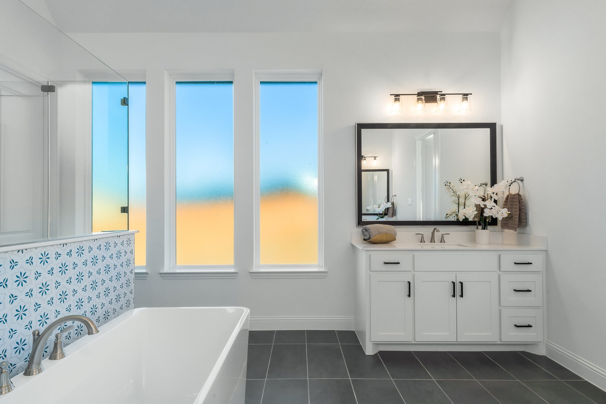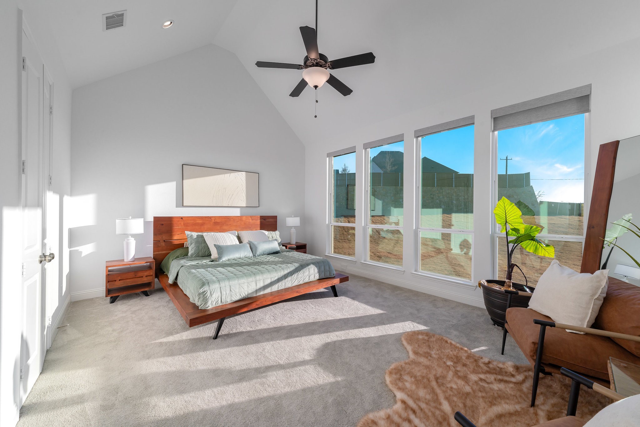 The spacious modern interior offers a Gourmet Kitchen full of expansive culinary spaces with stainless steel appliances, a double island, 6-burner gas stove, double oven, and ample storage. Live large in rooms with Cathedral ceilings and sliding glass doors creating seamless transitions between indoor and outdoor living. The spacious primary suite is a private retreat with an ensuite with separate vanities, garden tub, and a luxurious shower. Additional bedrooms offer ensuite amenities for ultimate comfort.