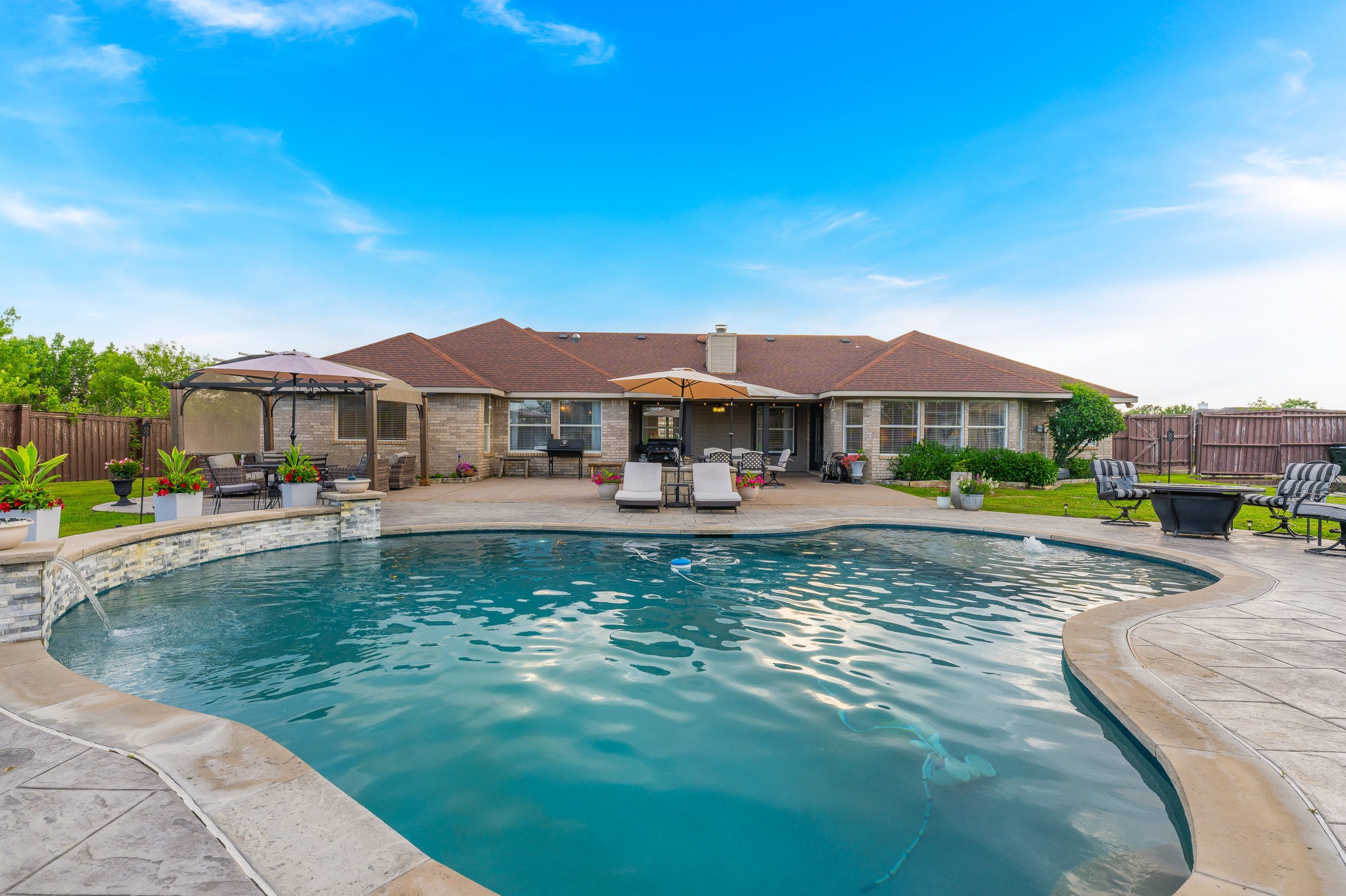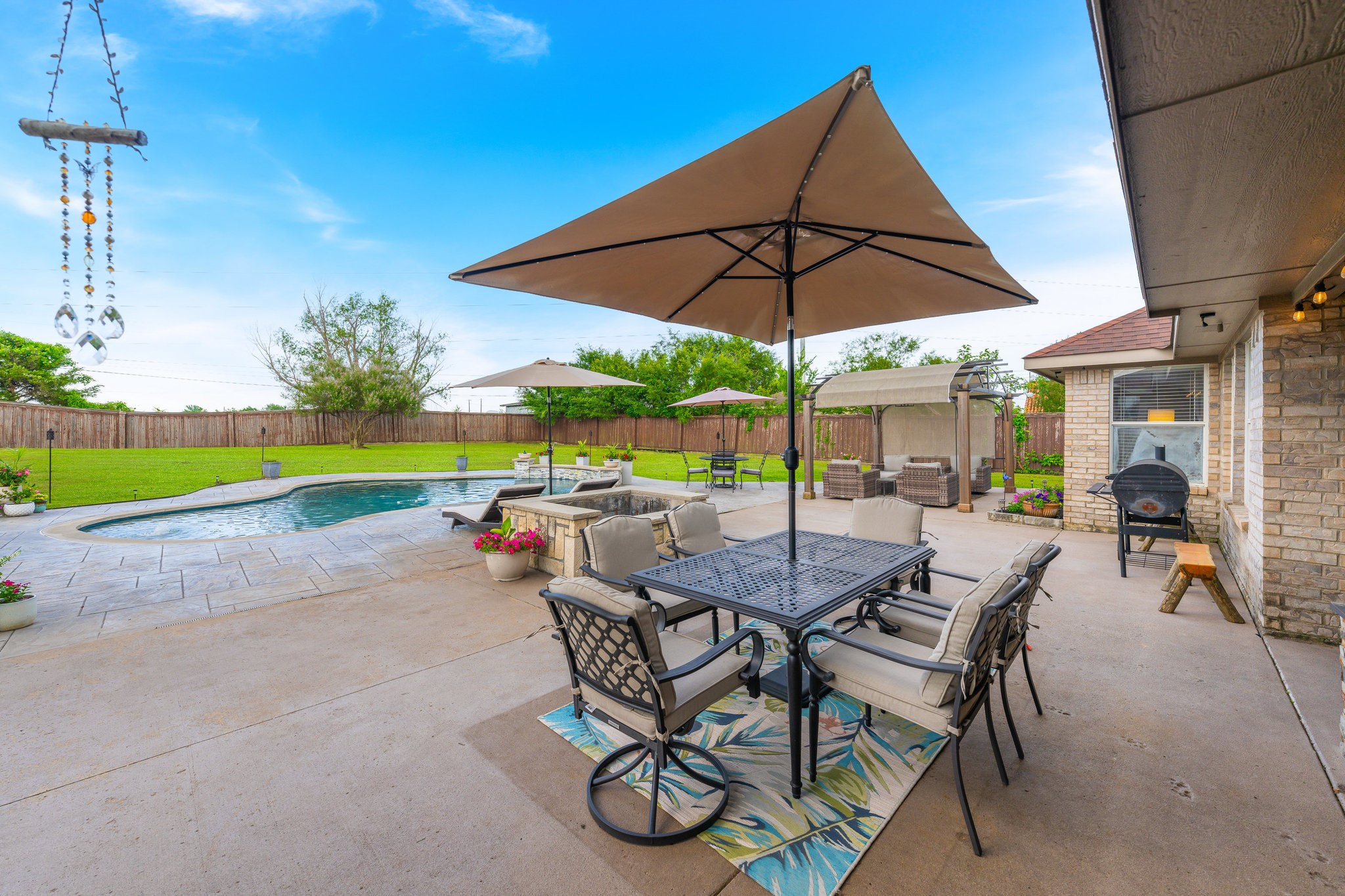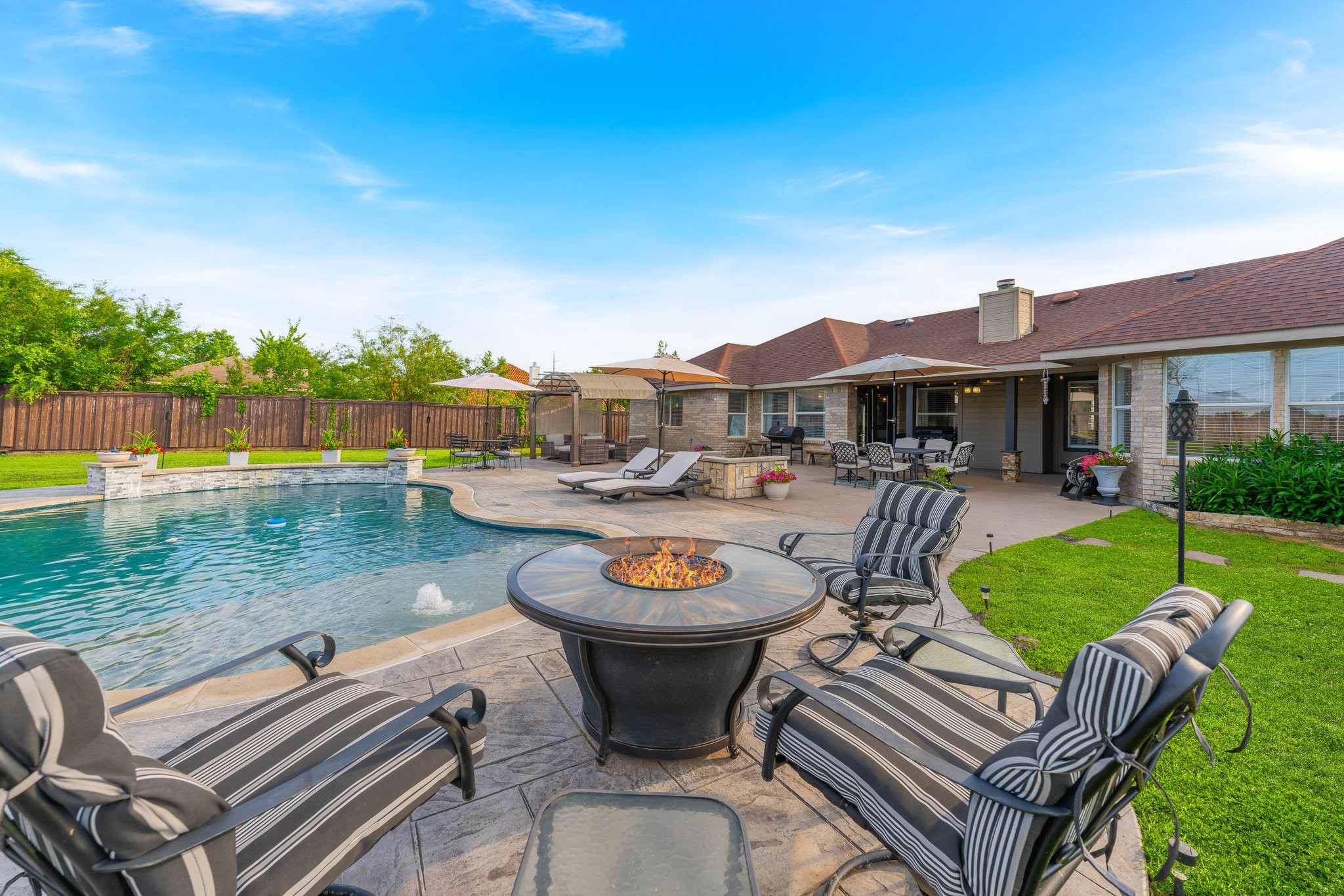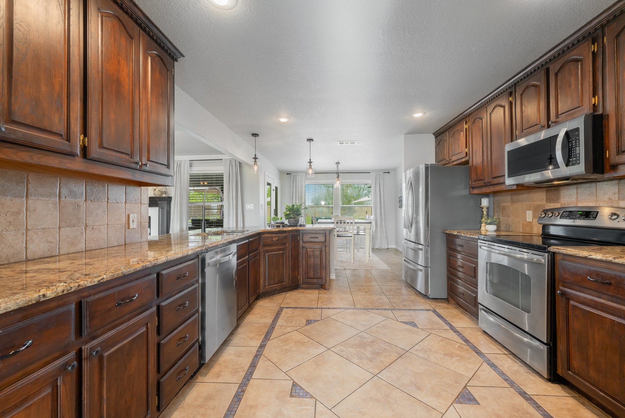 The kitchen is a chef's dream, featuring granite countertops, 42-inch cabinets, and stainless steel appliances, providing both functionality and timeless style. The oversized primary suite is a true retreat with a huge walk-in closet and beautifully refreshed bath. The real showstopper is the incredible backyard. Step outside to a resort-style pool, complete with water features, surrounded by lush landscaping, multiple seating areas, and a covered patio perfect for entertaining or quiet evenings under the stars. Whether you're hosting family gatherings or enjoying a peaceful morning coffee, this backyard oasis has it all.