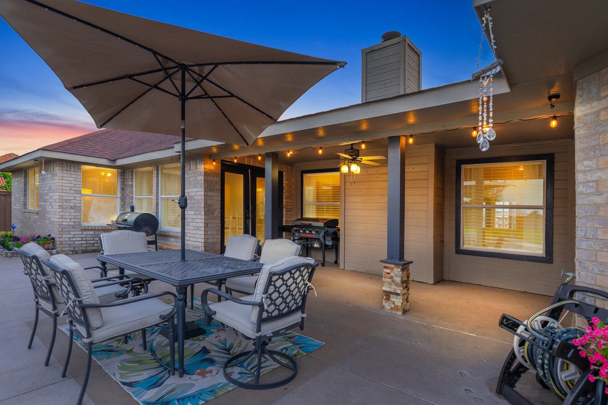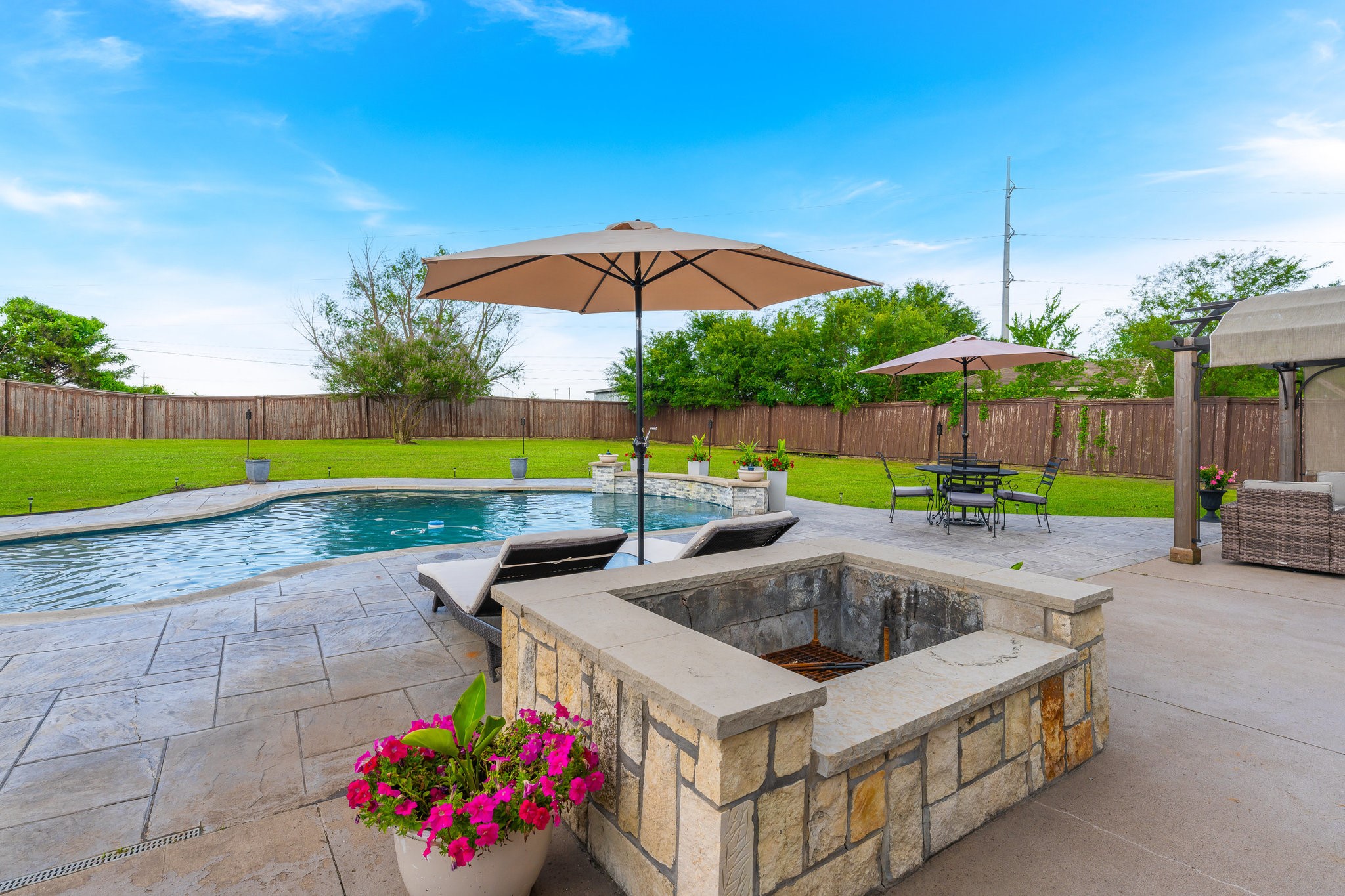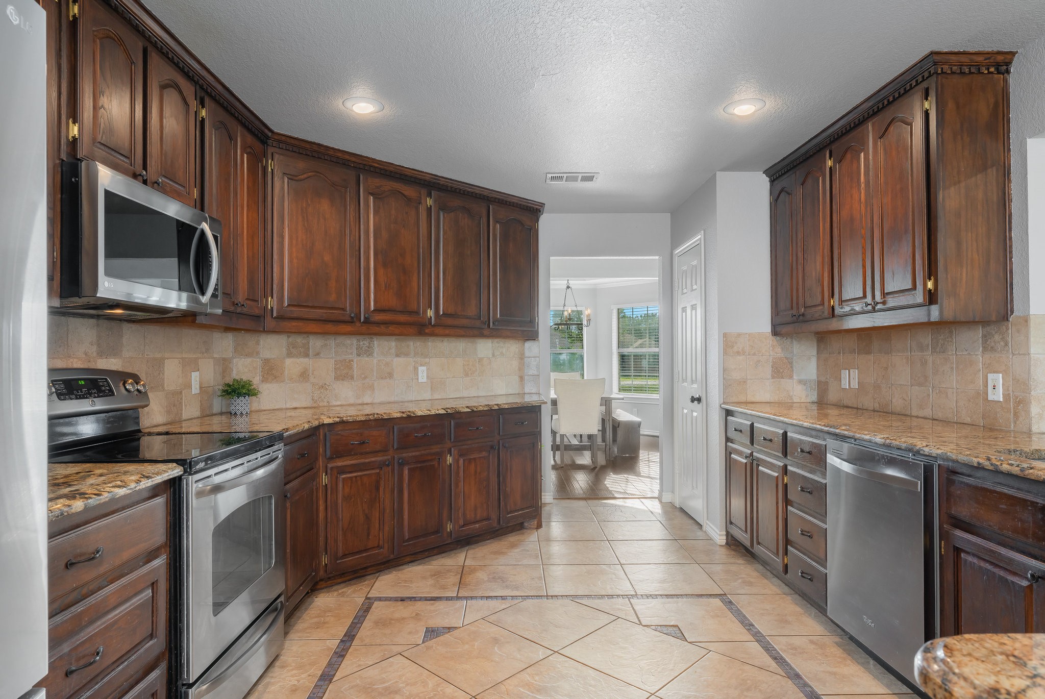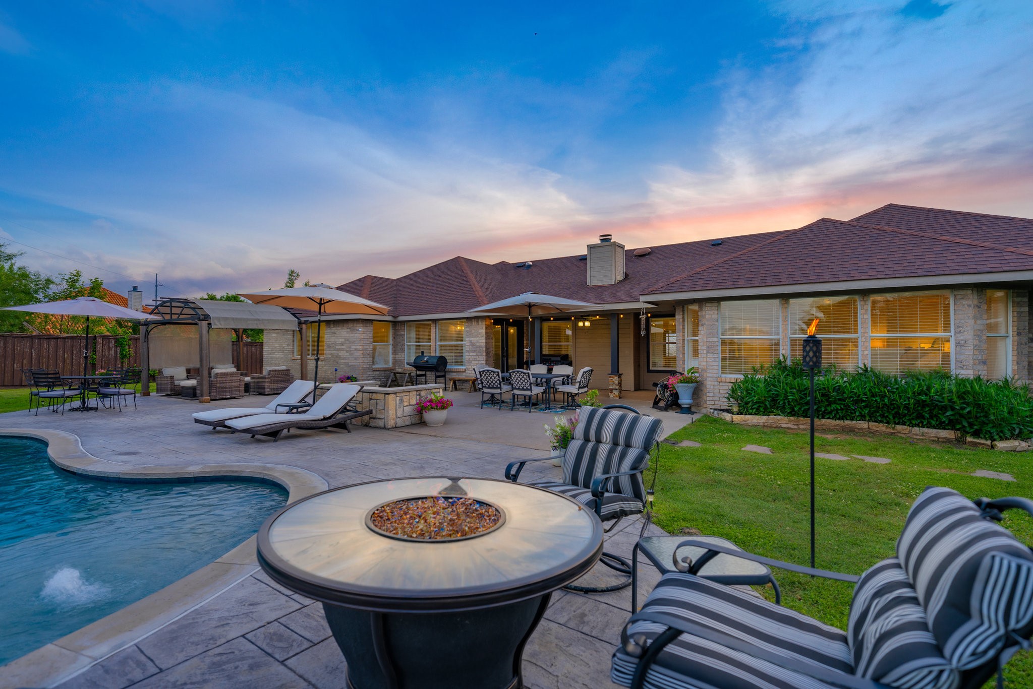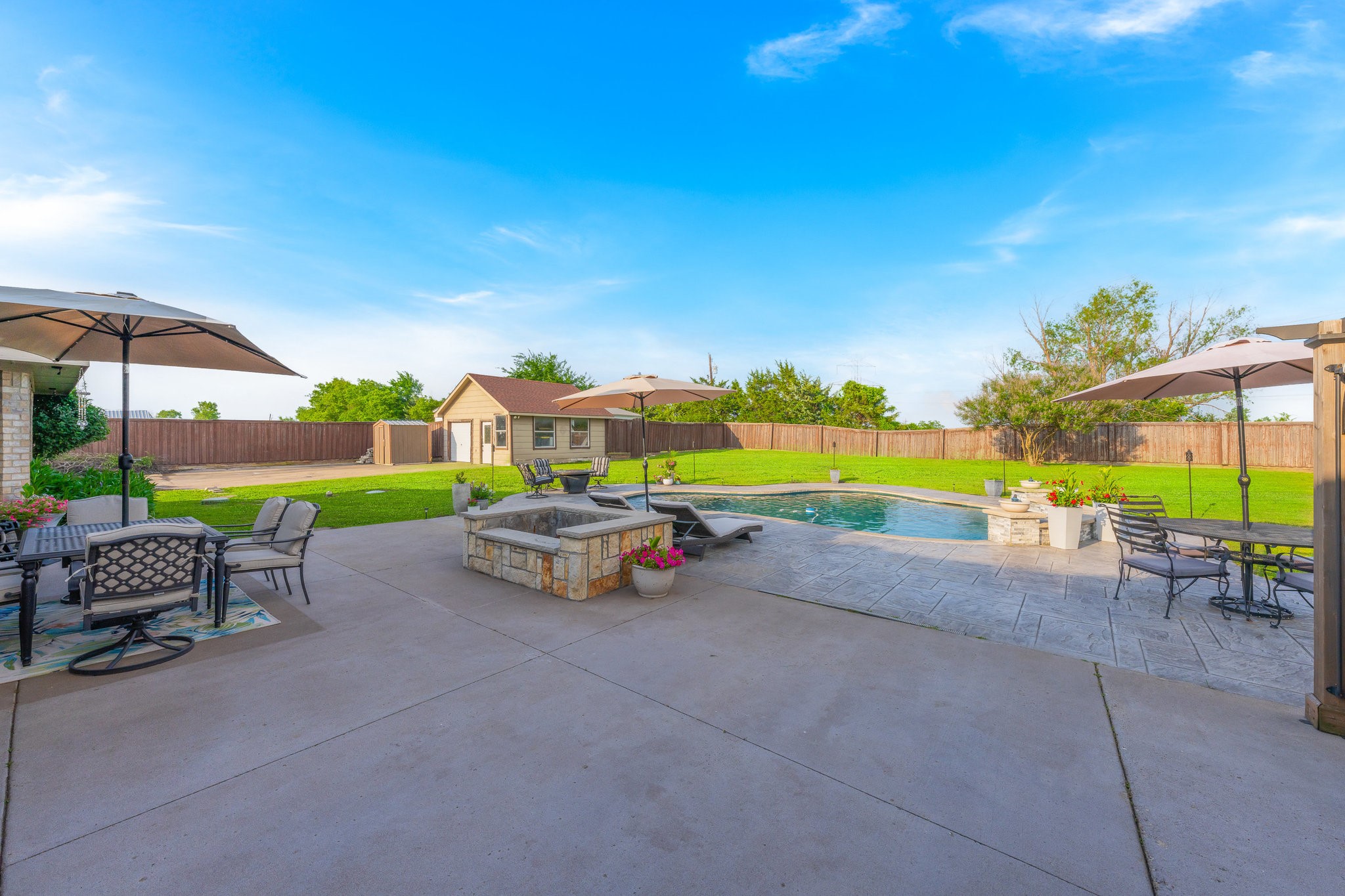 The kitchen is a chef's dream, featuring granite countertops, 42-inch cabinets, and stainless steel appliances, providing both functionality and timeless style. The oversized primary suite is a true retreat with a huge walk-in closet and beautifully refreshed bath. The real showstopper is the incredible backyard. Step outside to a resort-style pool, complete with water features, surrounded by lush landscaping, multiple seating areas, and a covered patio perfect for entertaining or quiet evenings under the stars. Whether you're hosting family gatherings or enjoying a peaceful morning coffee, this backyard oasis has it all.