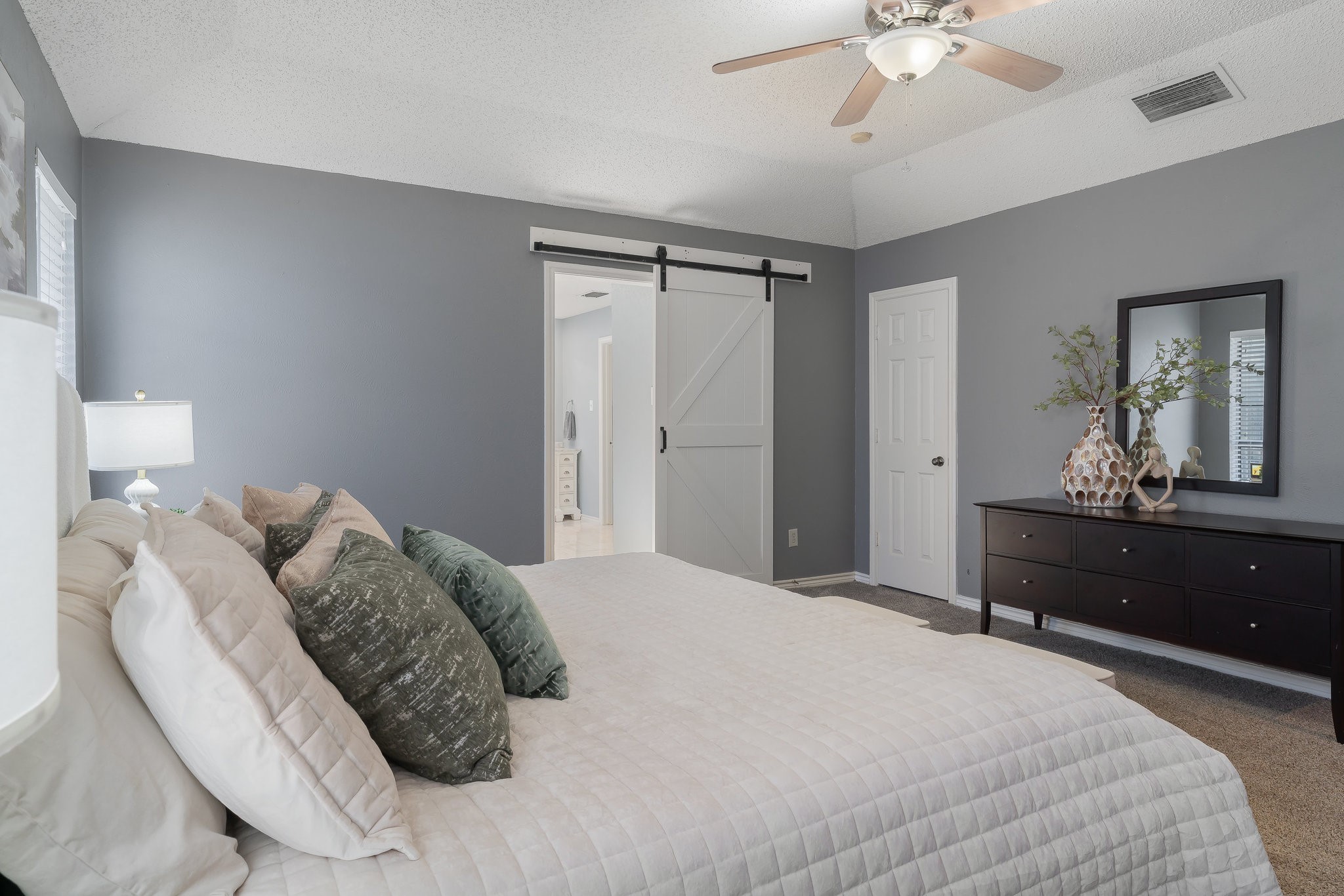 2.75% ASSUMABLE VA LOAN OPTION *Incredible rate, Incredible opportunity!* Single-story gem, in beautiful Bent Tree West, blending chic urban contemporary with a little rustic charm, functionality, beauty, and convenience. Spacious, open floor plan with airy, vaulted ceilings, exposed wooden beams, Luxury Vinyl Plank flooring, and updates throughout. The creamy stone fireplace is a double-sided centerpiece that anchors the living room and will be everyone's favorite go-to spot in the house for chill nights, fun hangouts, and a little ambiance. The living room effortlessly opens to the breakfast area and adjacent kitchen with beautiful bay window views, sleek, white cabinets, granite countertops, SS appliances, and eventually wraps around to the pretty dining room with front views through diamond-pattern windows. The cozy, large den is right around the corner from the living room, perfect for game nights, movies, or quiet time to yourself. Sharing the spotlight, and the fireplace, is the back flex space-office with a wall of windows that opens to the patio and backyard - the possibilities are plentiful. You'll find a slice of paradise in the primary suite with a barn door entry to a huge ensuite bath, dual vanities, plus a side vanity desk, a beautiful stand-alone tub, separate shower, two walk-in closets - all beautifully finished. Two guest bedrooms with walk-in closets, and an updated full bath in the hallway. Don't forget the extra powder bath for guests and large laundry with room for a refrigerator or extra pantry storage. Highly rated Plano schools + Trinity Christian, Levine, Prestonwood, Shelton, and many private schools nearby. Be sure to check out the Bent Tree West Swim and Tennis Center located in the neighborhood, with social events, a park, clubhouse, tennis & pickleball - it's a great way to meet the neighbors and get connected! Convenient to everything North Dallas, incredible value for the neighborhood, and incredible opportunity for a VA buyer.