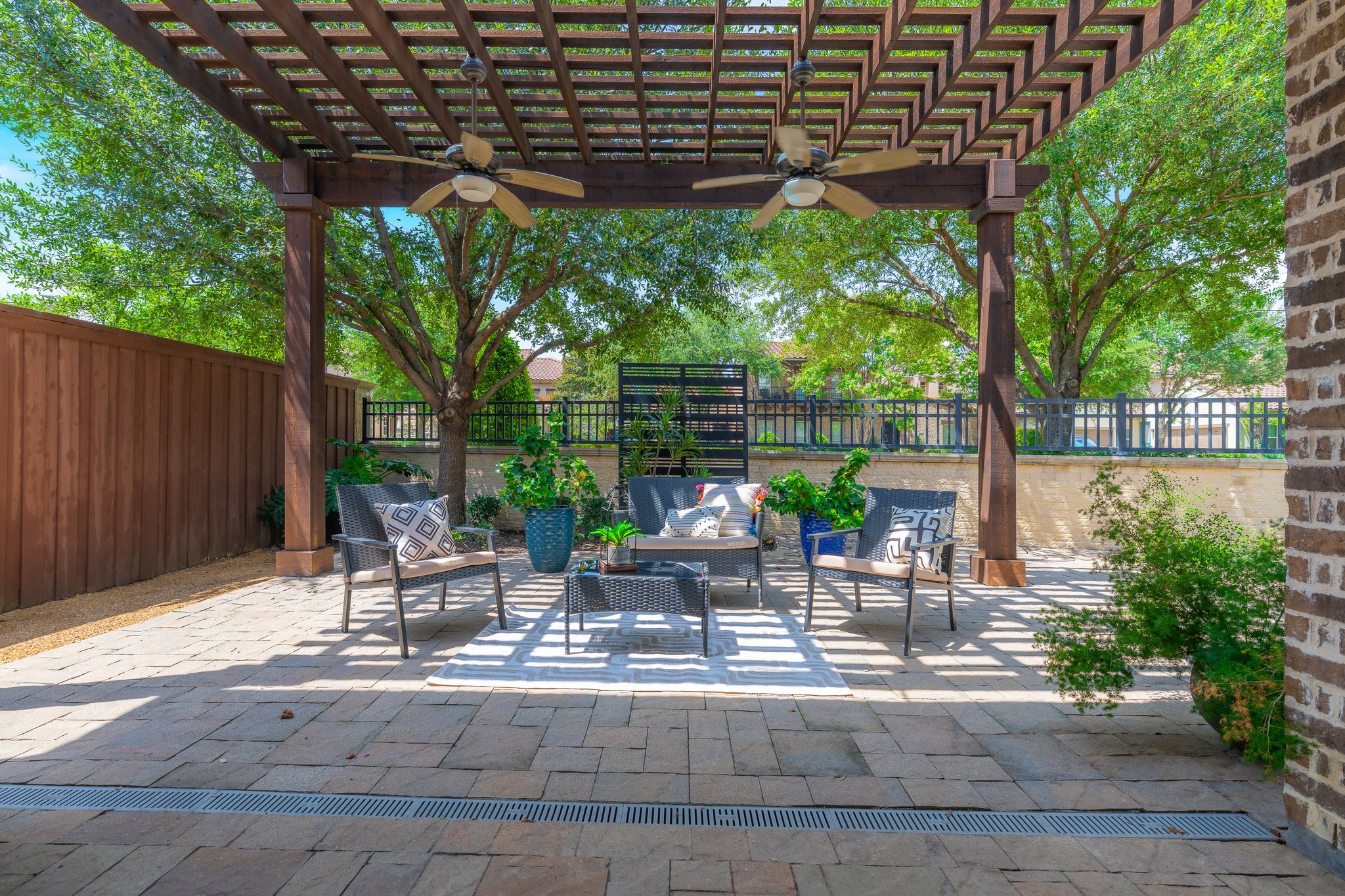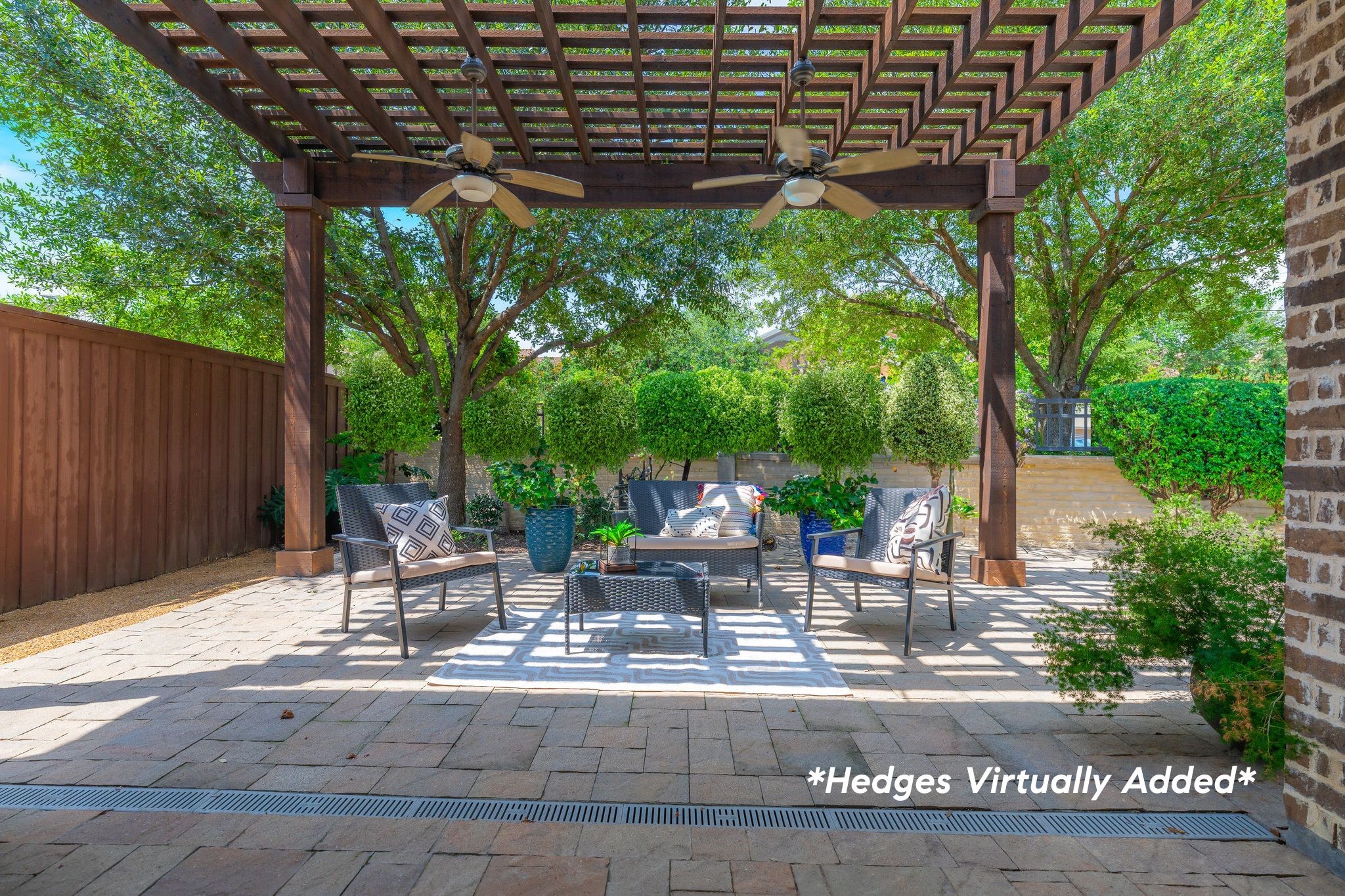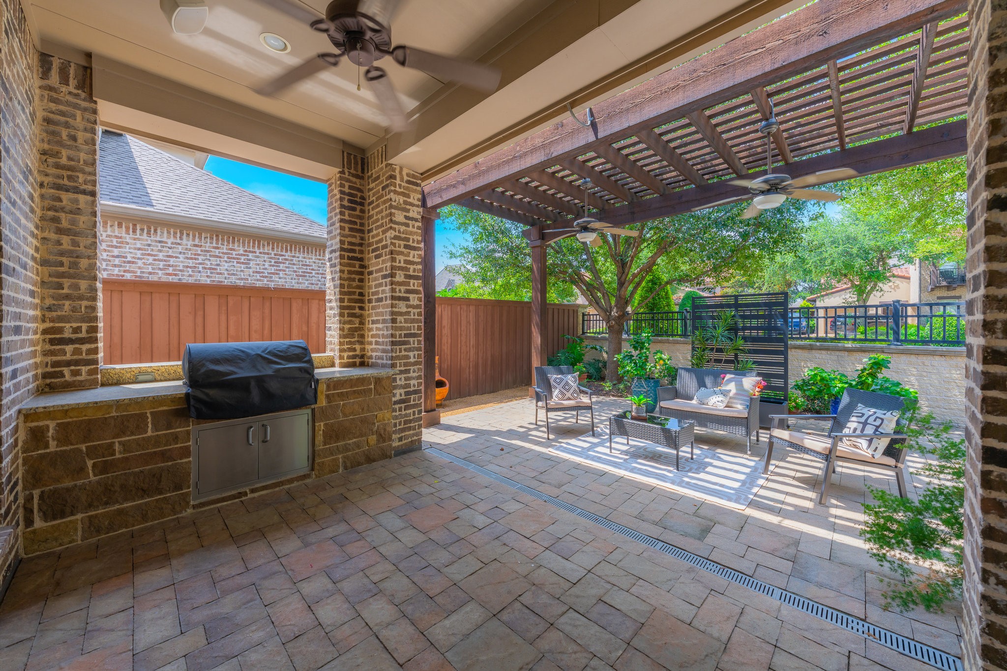Outside, the low-maintenance yard offers an inviting space for entertaining, complete with a built-in grill. There's room to add a pool if desired, and tall hedges can be installed for additional privacy--creating your own backyard retreat.