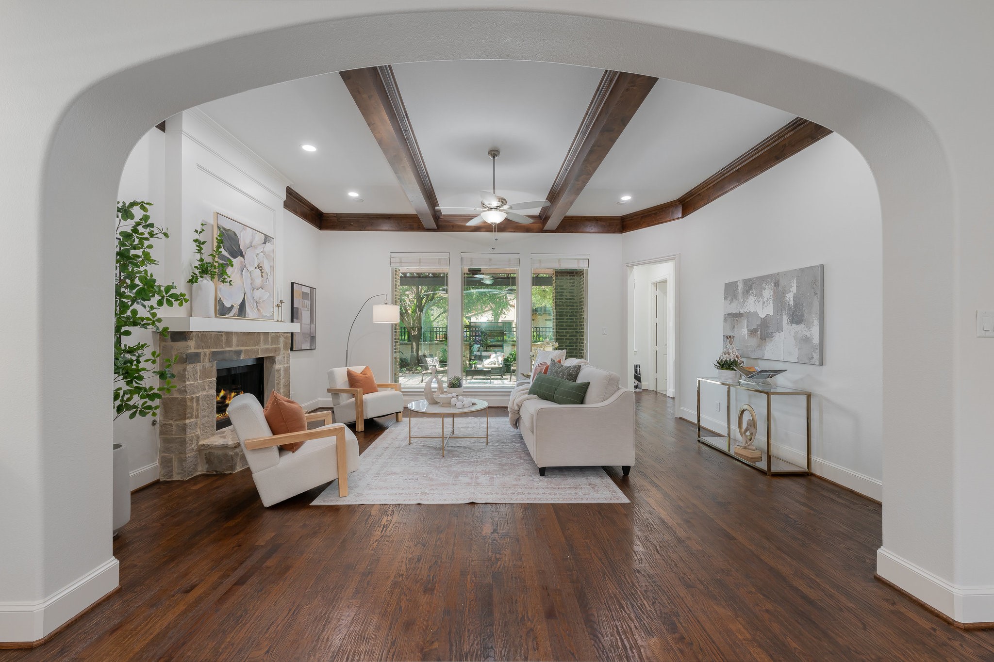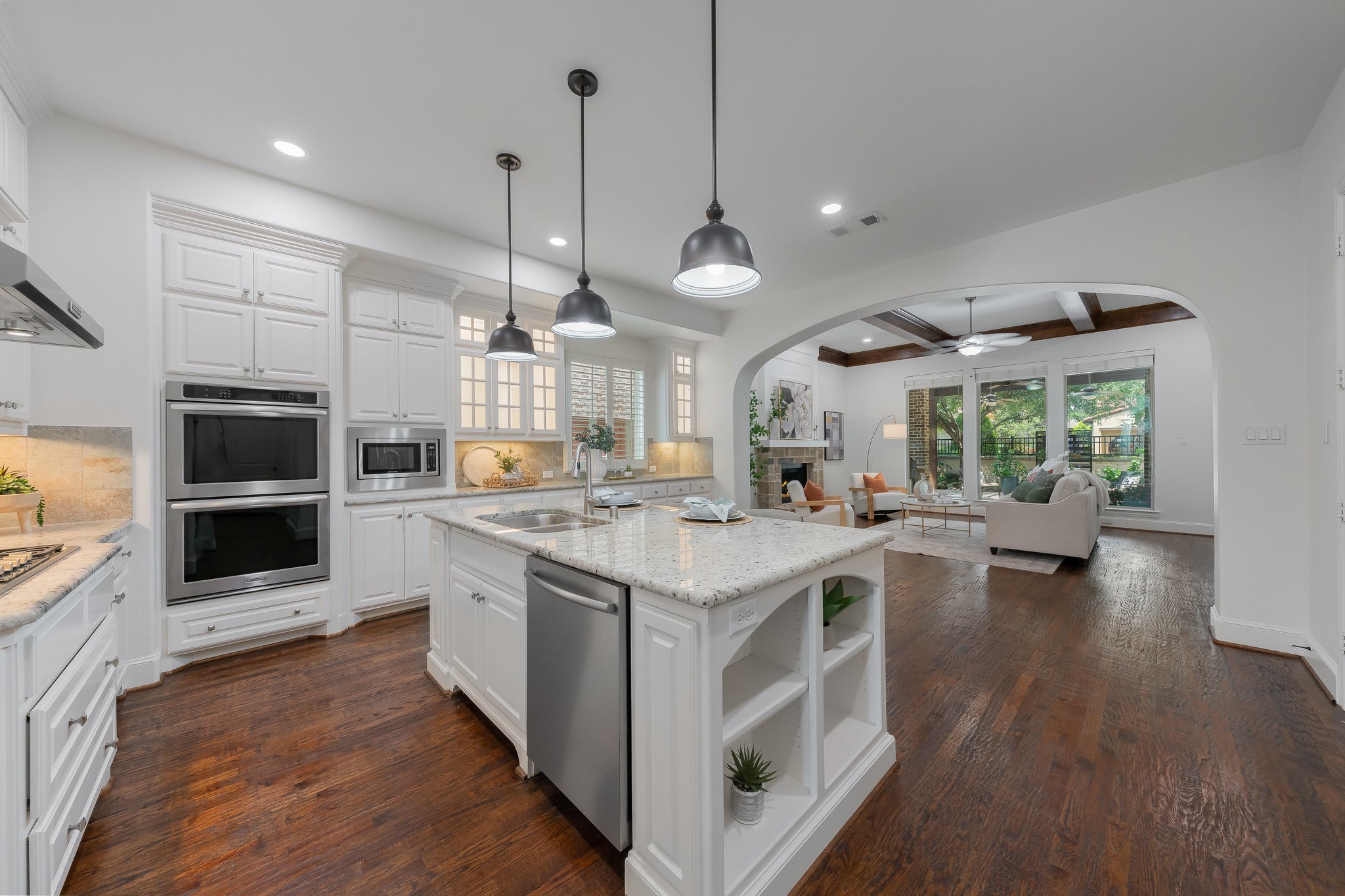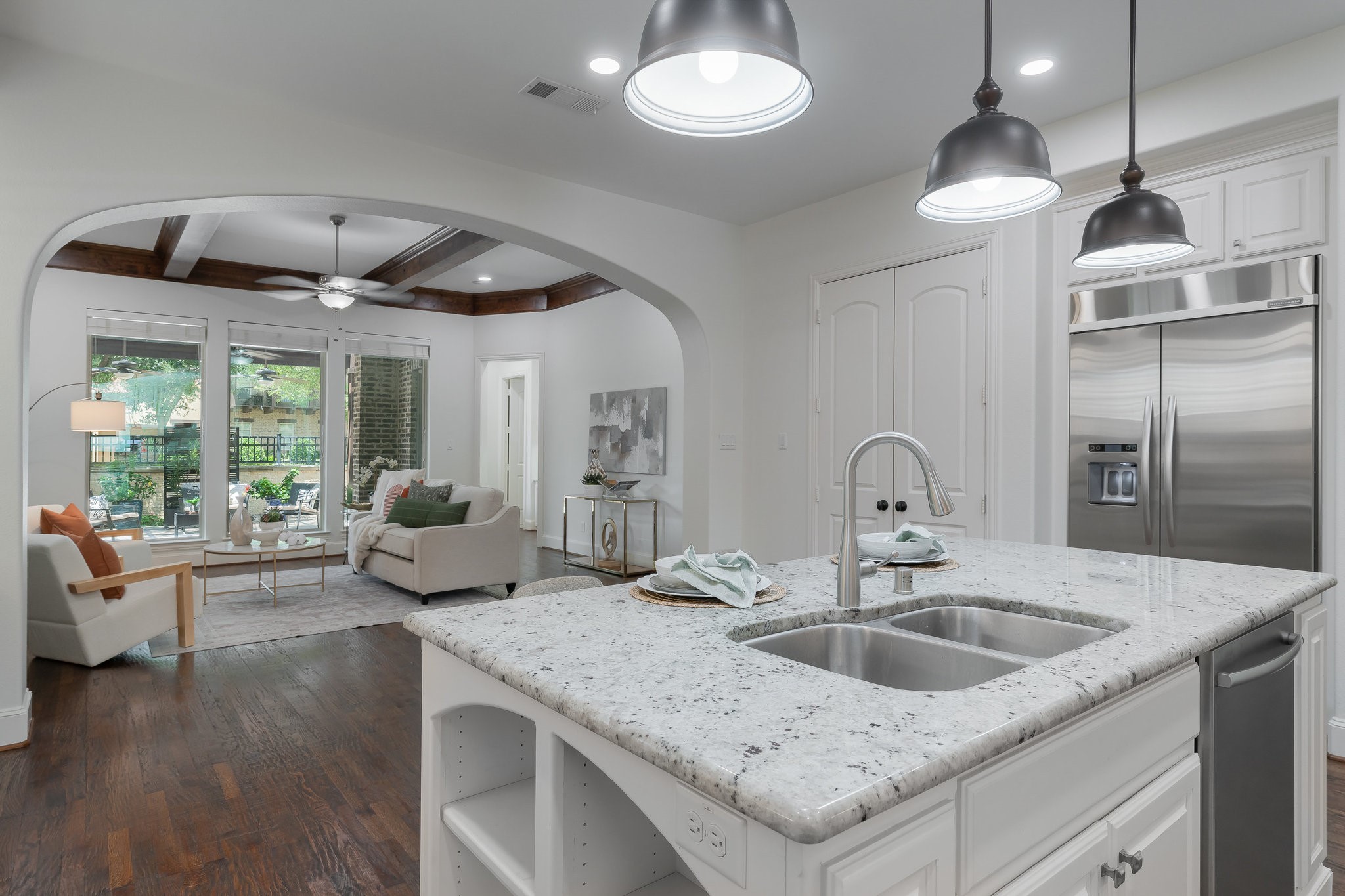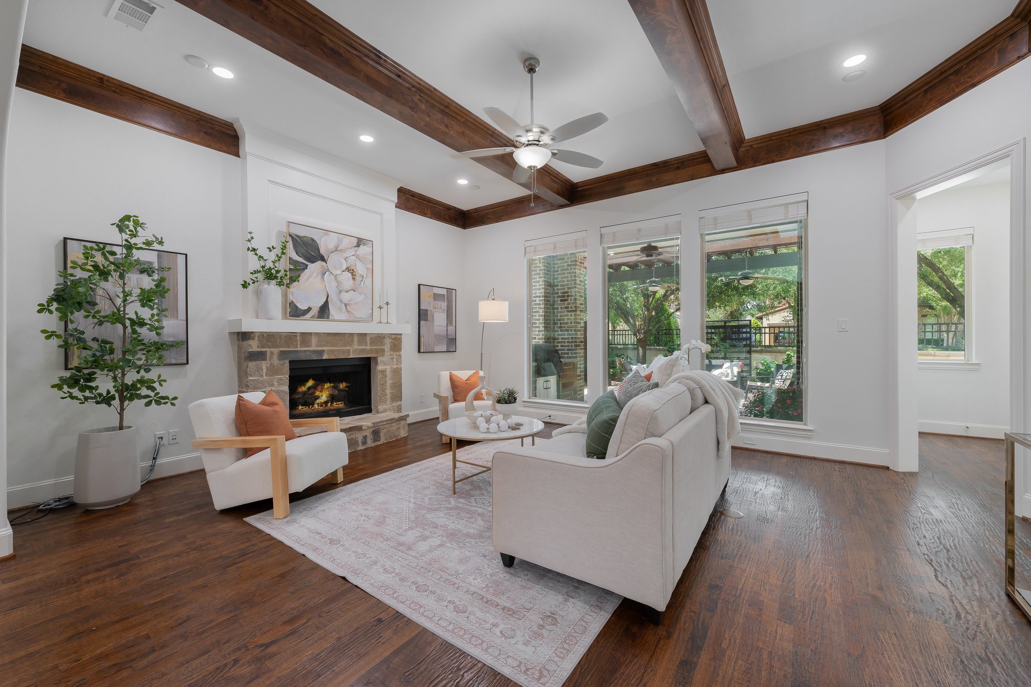 Outside, the low-maintenance yard offers an inviting space for entertaining, complete with a built-in grill. There's room to add a pool if desired, and tall hedges can be installed for additional privacy--creating your own backyard retreat.