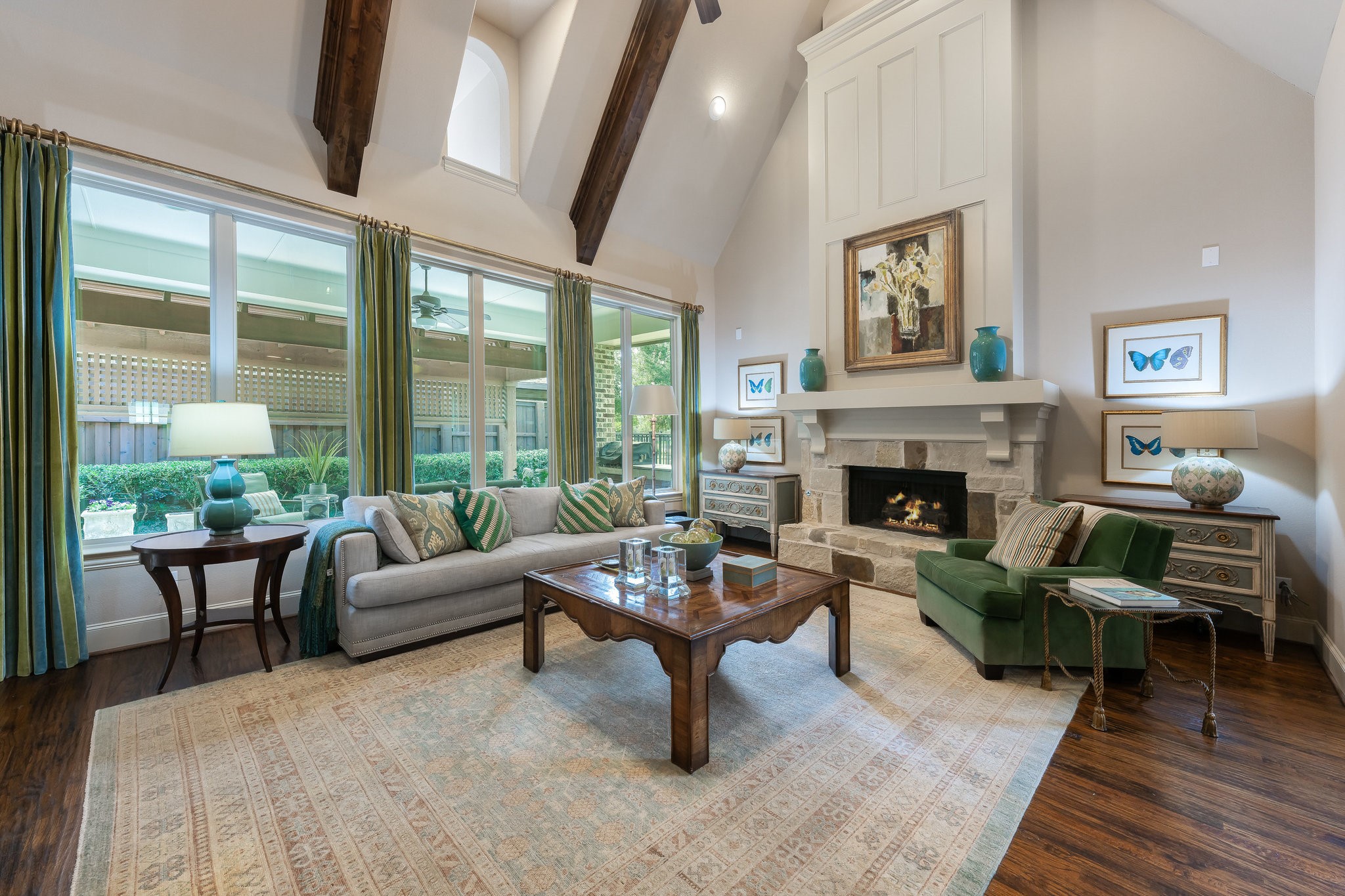 An open-concept floor plan creates effortless flow throughout the main living spaces, highlighted by a hardwood floors, coffered ceiling in the office, vaulted ceilings in the living room and primary suite with beam accents. The gourmet kitchen features stainless steel appliances, a gas cooktop, double ovens, and a built-in refrigerator. The expansive living and dining areas make this home ideal for both relaxed gatherings and formal entertaining. The spacious primary suite is a private retreat with abundant natural light and a luxurious ensuite bath. Additional bedrooms offer flexibility for family, guests, or a home office setup.